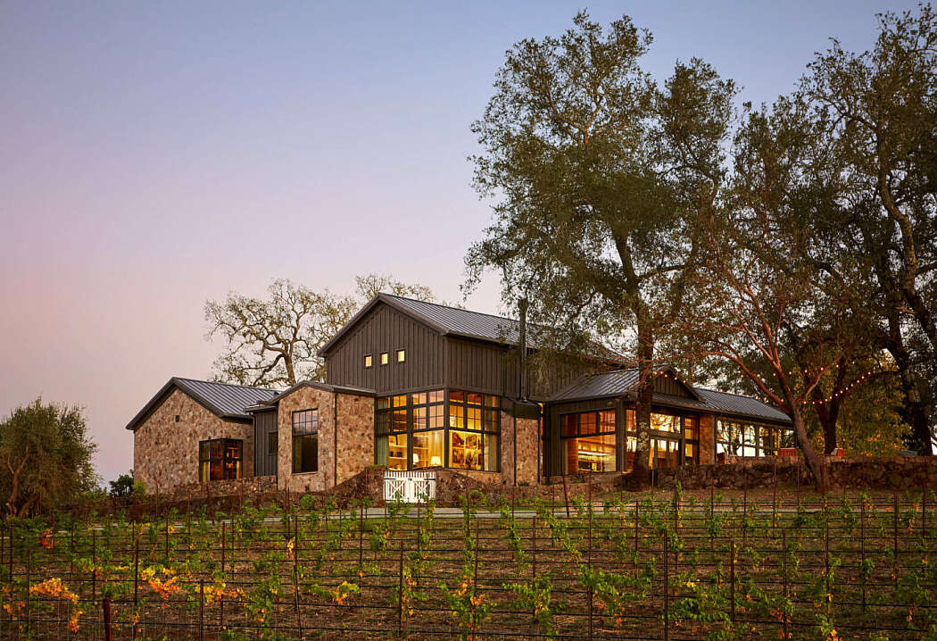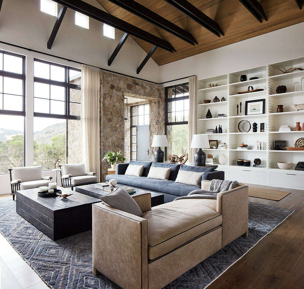 Views, undoubtedly, played a pivotal role in the design choices. In fact, many of the most captivating views are positioned at the corners of primary spaces. For instance, from the living room, one can effortlessly catch a breathtaking glimpse of Mt. Saint Helena, marking the start of Napa Valley. Responding to this, the architecture cleverly blends modern airy corner windows with traditional rustic materials.
