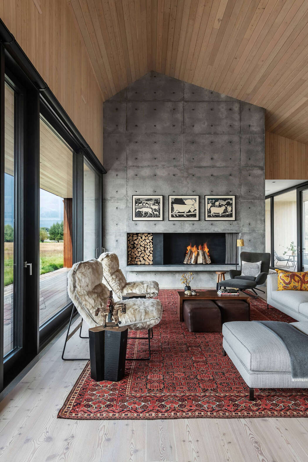 Inside, the design ethos stays simple. Oxidized steel wraps the exterior, while the interior showcases steel, glass, and concrete. Larch wood, with its warm, rustic charm, occasionally ascends from walls to ceilings, then extends outdoors. The home’s heart is an expansive open space, anchored by a kitchen and a molded concrete fireplace. Bedrooms bookend this space, leading to secluded terraces.