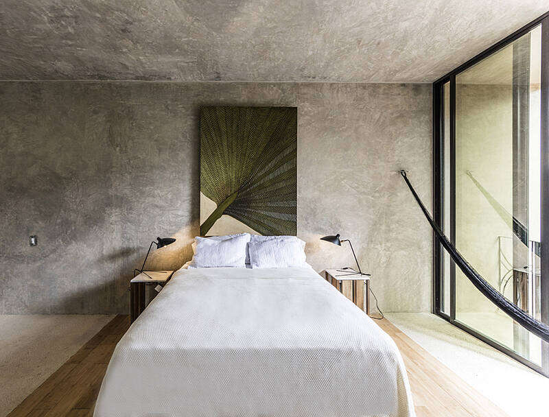 In contrast, the new section feels fresh and modern. A big half-circle cutout lets in lots of light and air. The ground floor has smooth gray walls and floors. But upstairs, the rougher floor adds a cozy touch.
