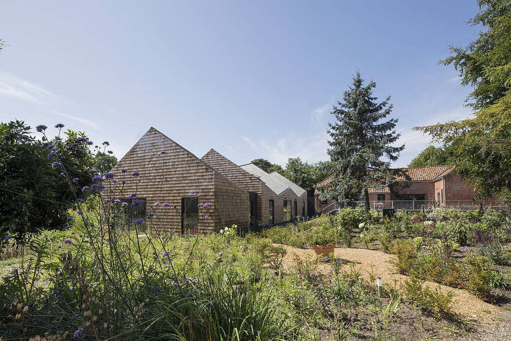 What sets this building apart is its distinct roof profile. This wavy form not only lends dynamism to the duplex interiors but also encapsulates the entire structure in cedar shingles. Inside, each room boasts spacious living, dressing, and bathing areas. Transitioning to the bedroom involves climbing a custom-crafted staircase. Moreover, the fifth bedroom showcases enhanced grandeur: its 6-meter (19.7 feet) high living space opens up to curated views of lush gardens and the sprawling Suffolk landscape.