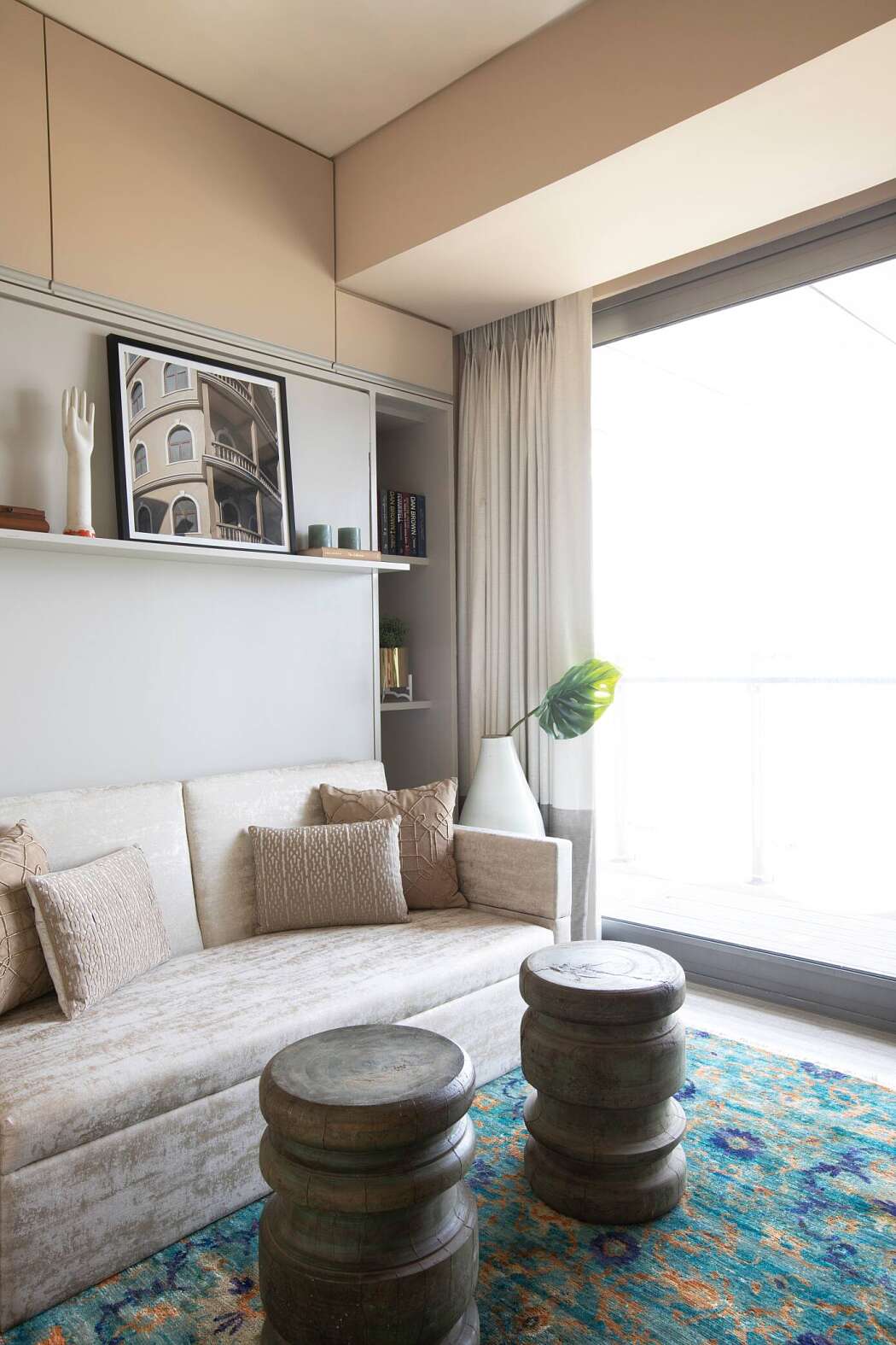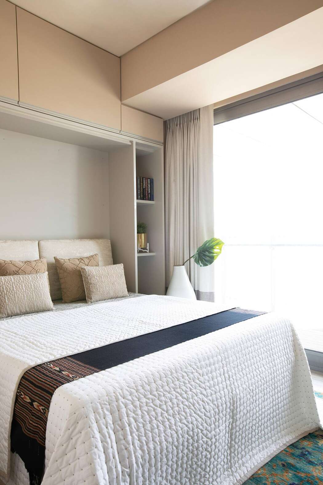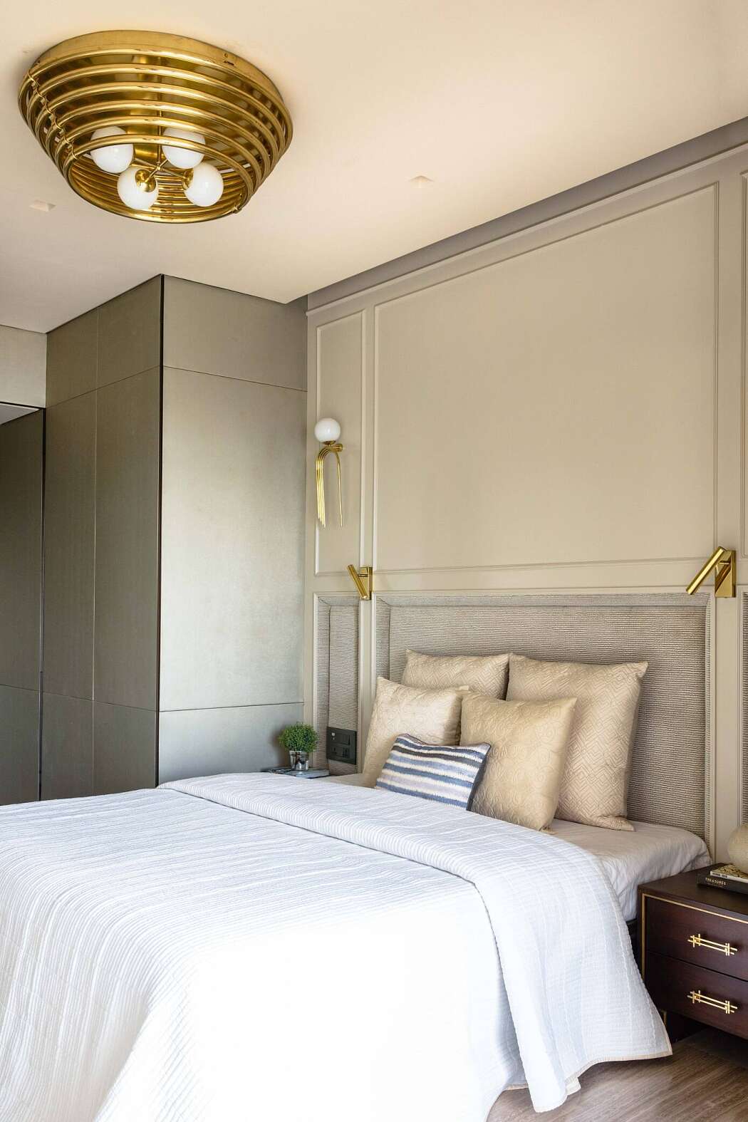 For the compact guest room, we integrated a wall-mounted fold-out bed, enabling a swift transition to a study, and embraced a neutral palette. Pastels animated the daughter’s bedroom, while the master bedroom radiated with hues of ivory and brass.