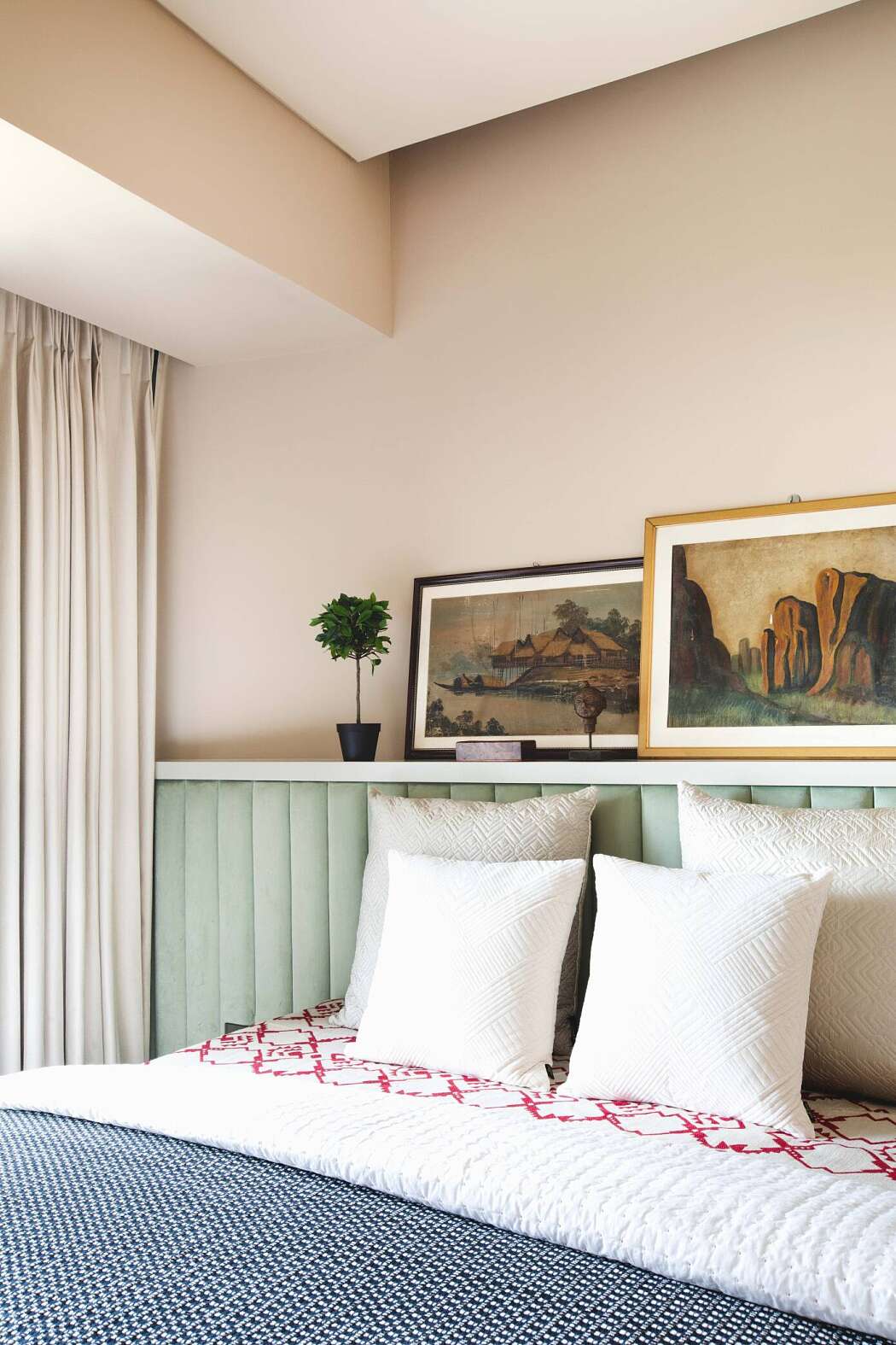 The first bedroom cleverly hides a pull-out bed within the wall. The daughter’s sanctuary showcases a Vistoso bed, Cocoon rug, and a mint green velvet headboard from Bharat Furnishings. Notably, Arjun Rathi’s light elevates the ambiance. In contrast, the master bedroom features fabric panelling from Atmosphere, wall scones, a chandelier from Arjun Rathi, and custom bedding.