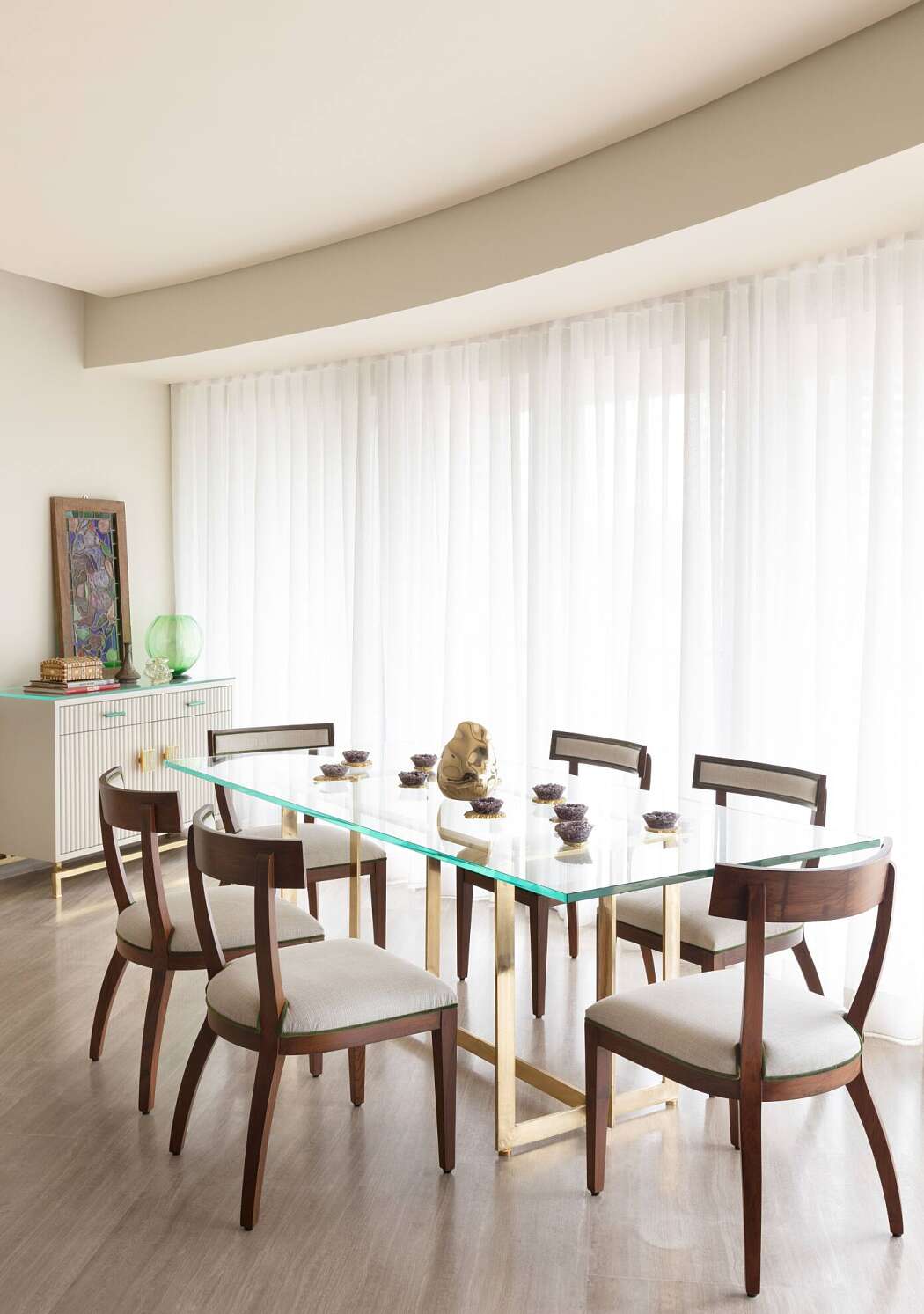 Entering the home, a teakwood console (crafted onsite) welcomes you, adorned with hanging lights from White Teak. Venturing into the living room reveals an Essajees tan sofa, Blue Loft’s green swivel armchairs, and a center table from Defurn—all resting on a Jaipur rugs carpet. In one corner, Arjun Rathi’s Shikara standing light accents the room, paired with a striking Chinese cabinet from Essajees. The dining area boasts a brass-based table and chairs from Essajees, while an onsite-crafted dining console with malachite handles from Viya Home completes the scene.