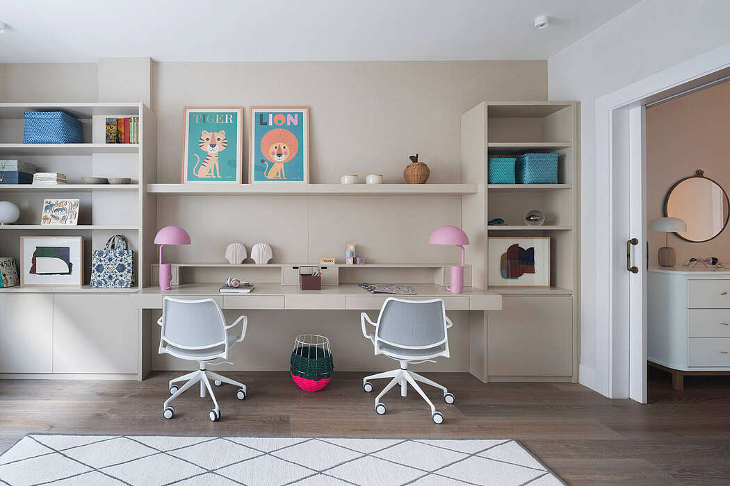 A palette of serene, understated hues pervades. Microcement graces the kitchens and bathroom. Every design choice converges to establish an enduring, harmonious aesthetic.