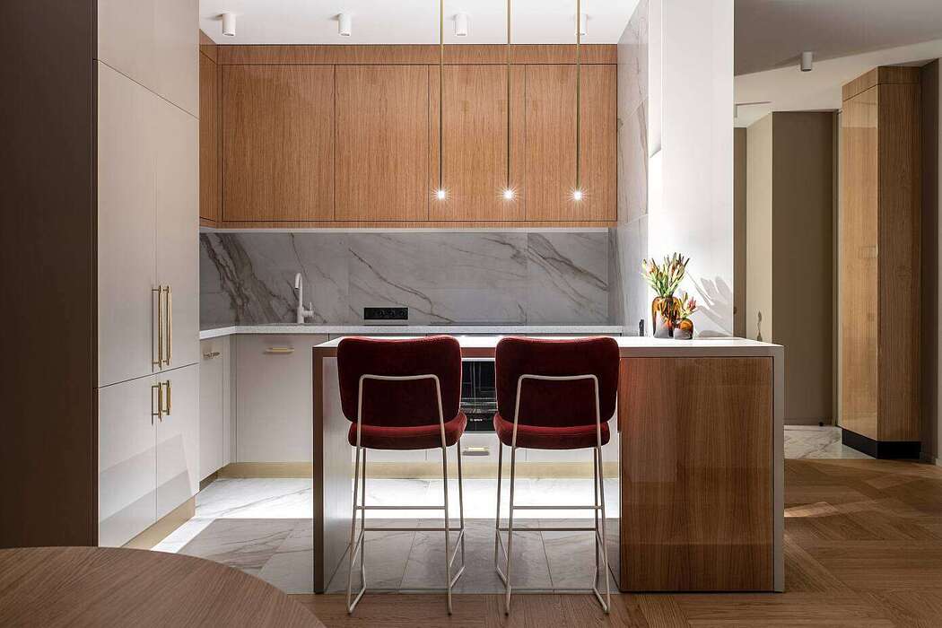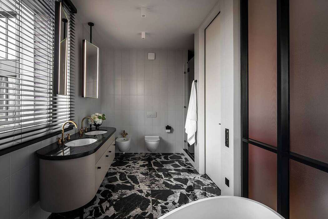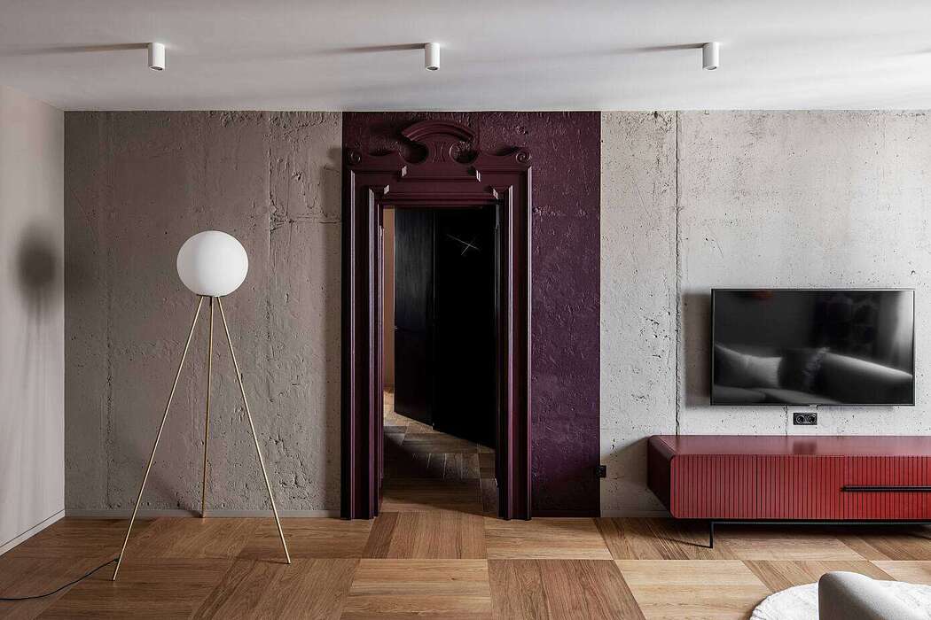 The design showcases a blend of contrasting materials and rich colors. Native concrete walls pair with a carved portal. Textured marbled porcelain tiles play against the resonant polyester coating of oak facades. The design harmoniously mixes brass with stucco and crystal, glossy stone floors with matte tiles, and gleaming silk curtains with stark black linen.