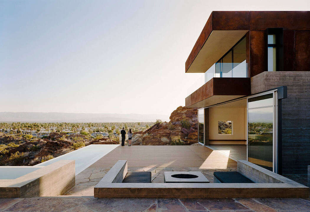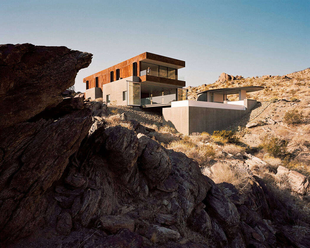 The concrete’s light browns and tans mirror the site. Cor-ten steel cladding offers a naturally weathering facade.