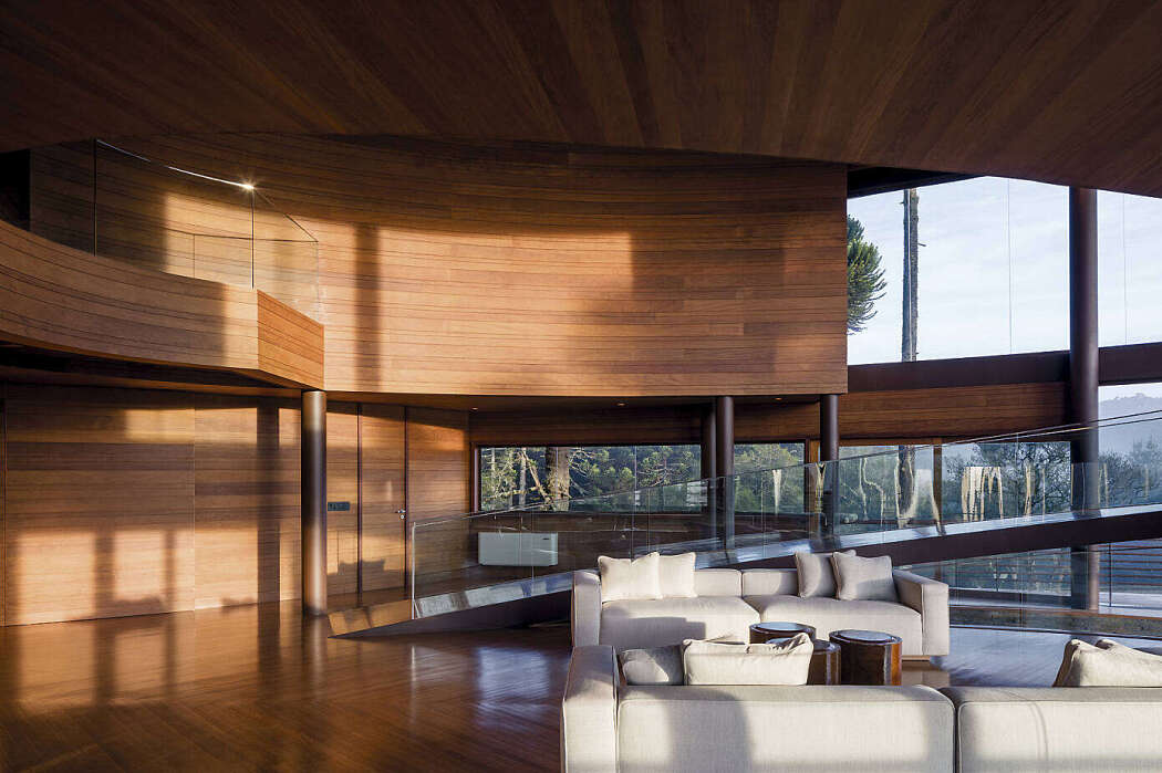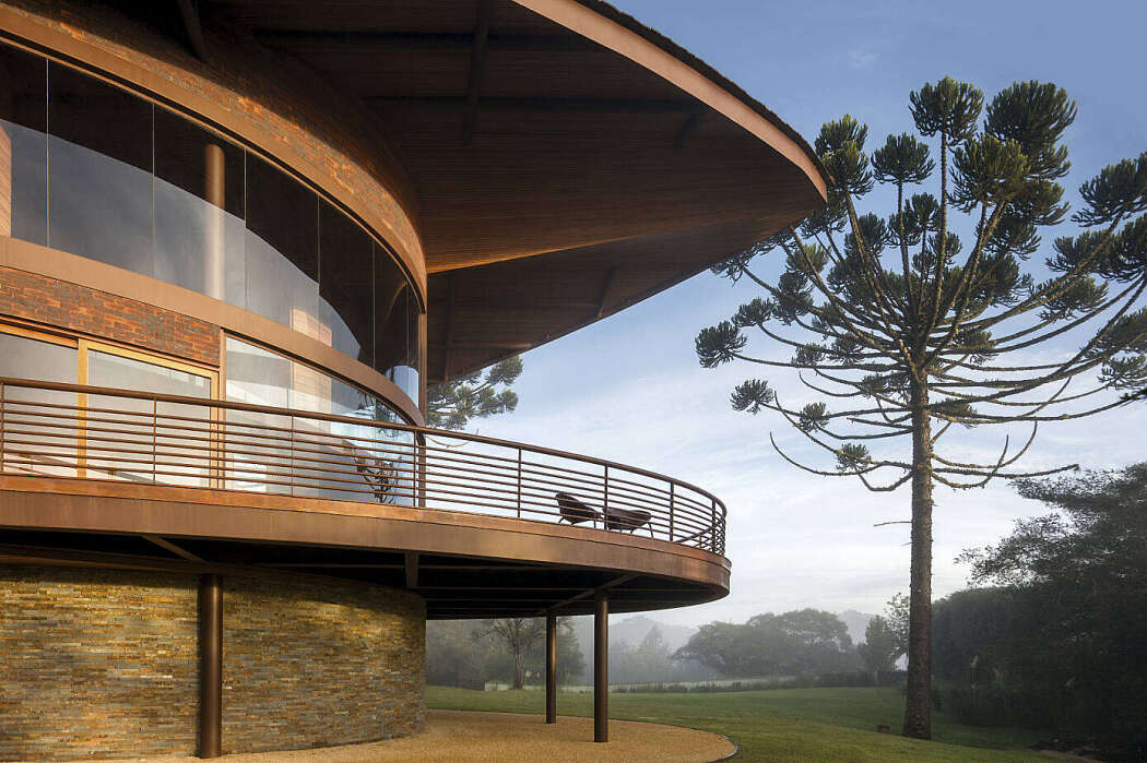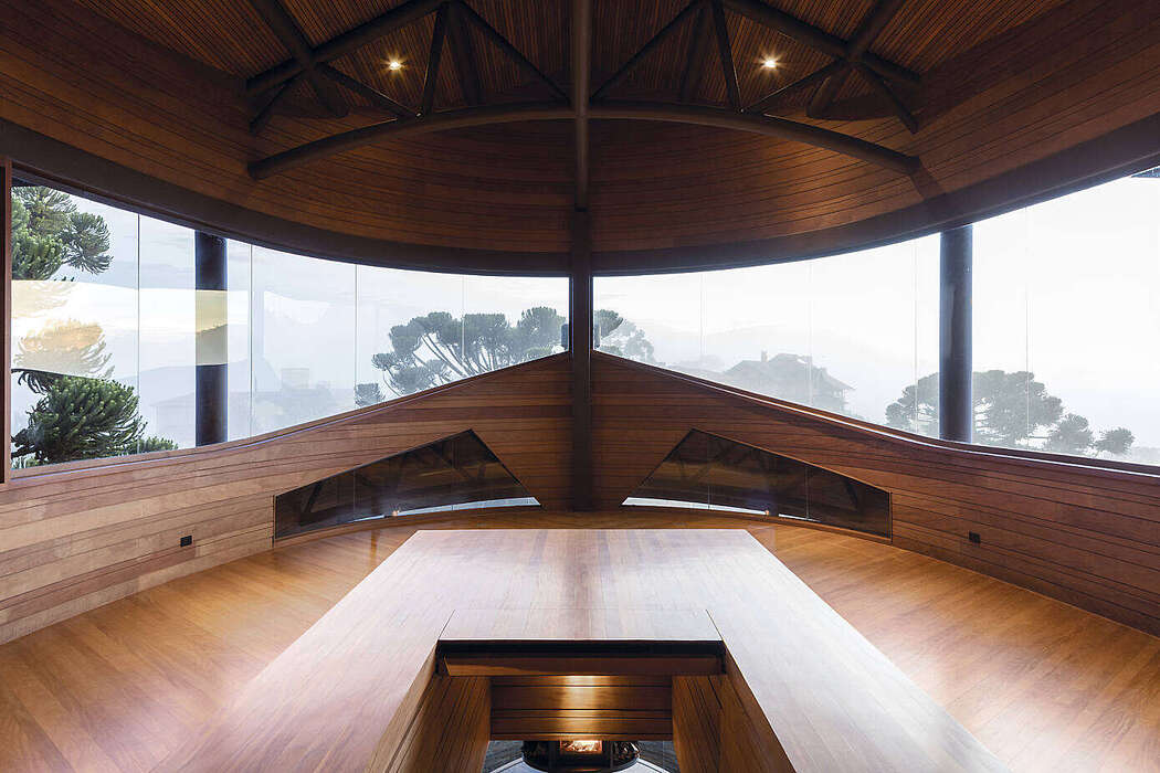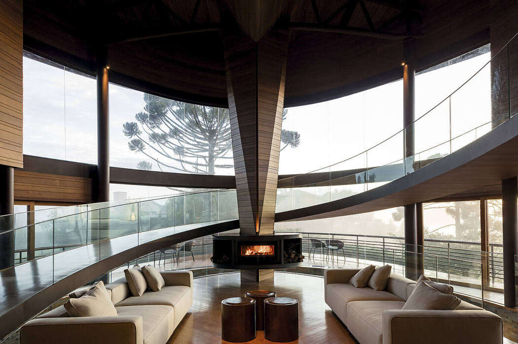 Above the social space lie four suites and a home office, offering 180-degree vistas of the mountains and native ARAUCARIA trees. The roof’s intricate geometry unmistakably echoes the PINHÃO, tying the design back to nature.