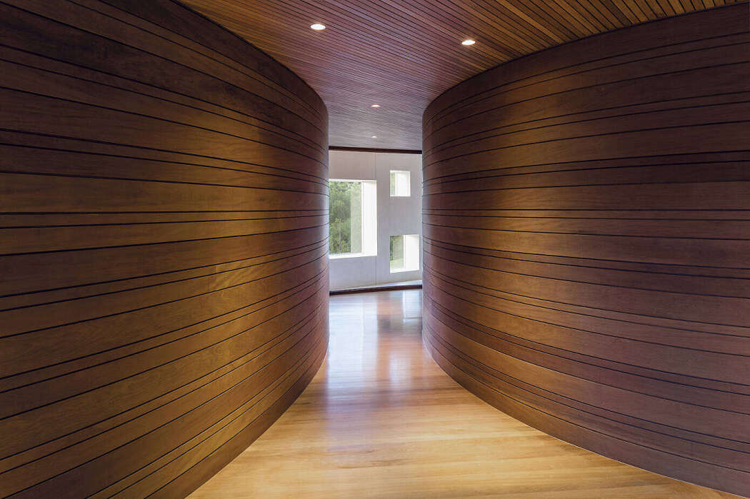 The entrance hall at this level sets the stage for an enlightening ascent. Climbing the dim, curved ramp reveals ever-brightening views, culminating in a breathtaking panorama in the living room.