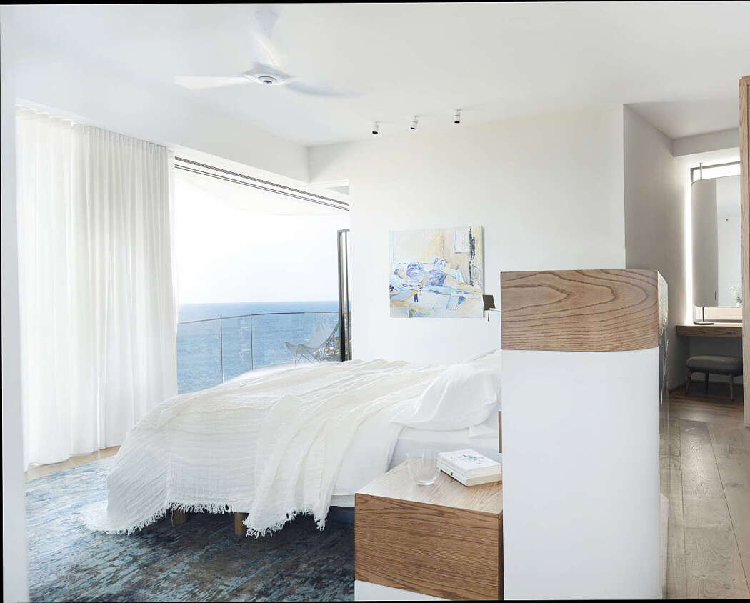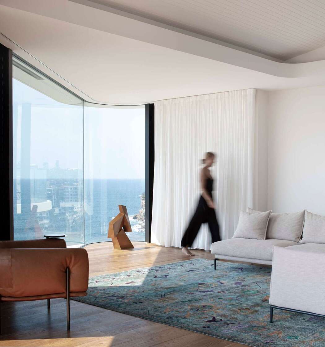 The residence’s upper stories stretch towards the horizon, reminiscent of a ship’s bowsprit. A curved glass panorama on the top floor captures iconic sights from Bronte Beach to Bondi’s headlands. Decks provide commanding views, while a floor below, panoramic windows and a breezy balcony deliver solace and inspiration.
