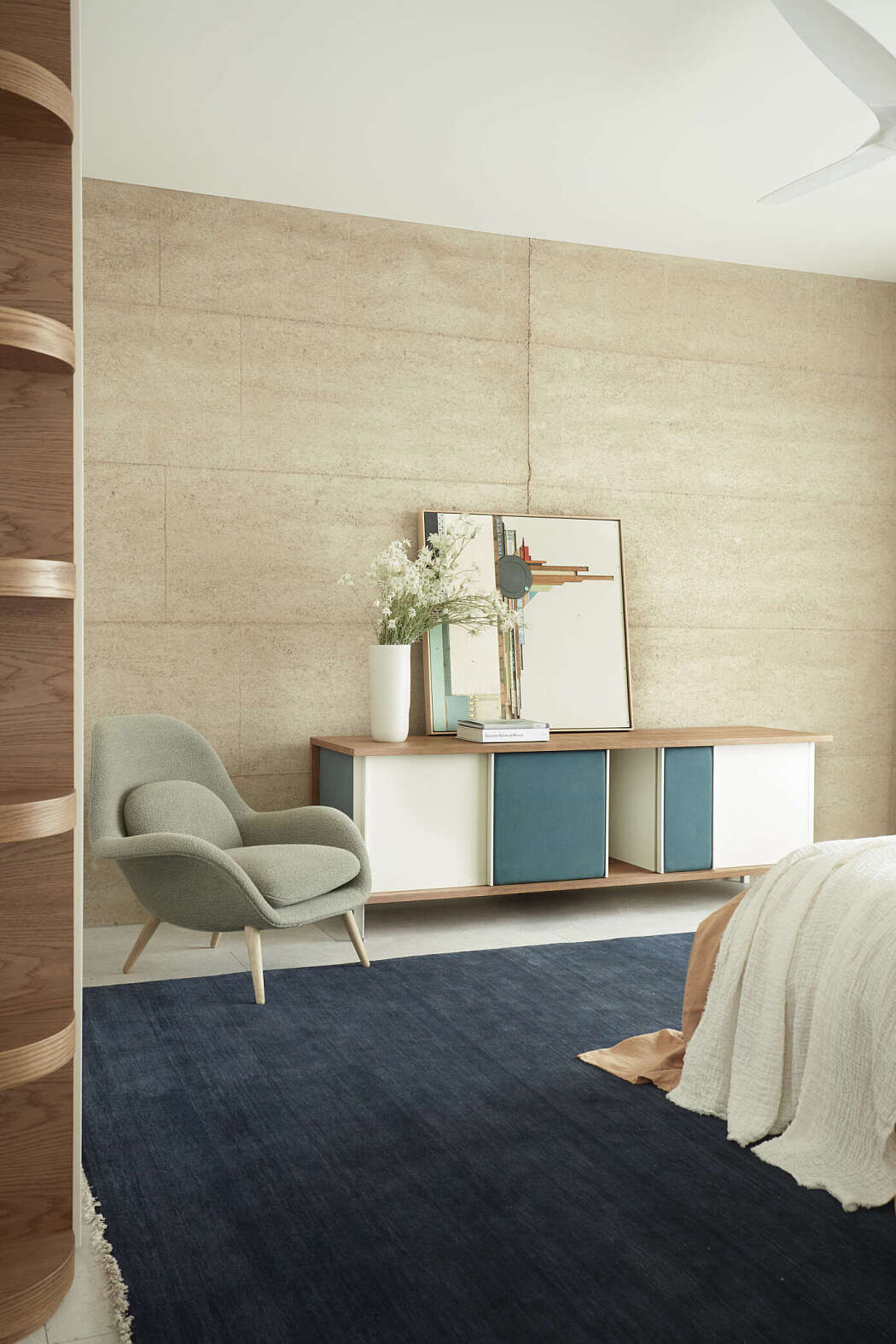 The ground and lower floors employ rammed earth and sandstone, anchoring the home between sea and sky. Modest window openings manifest a grounded perspective.