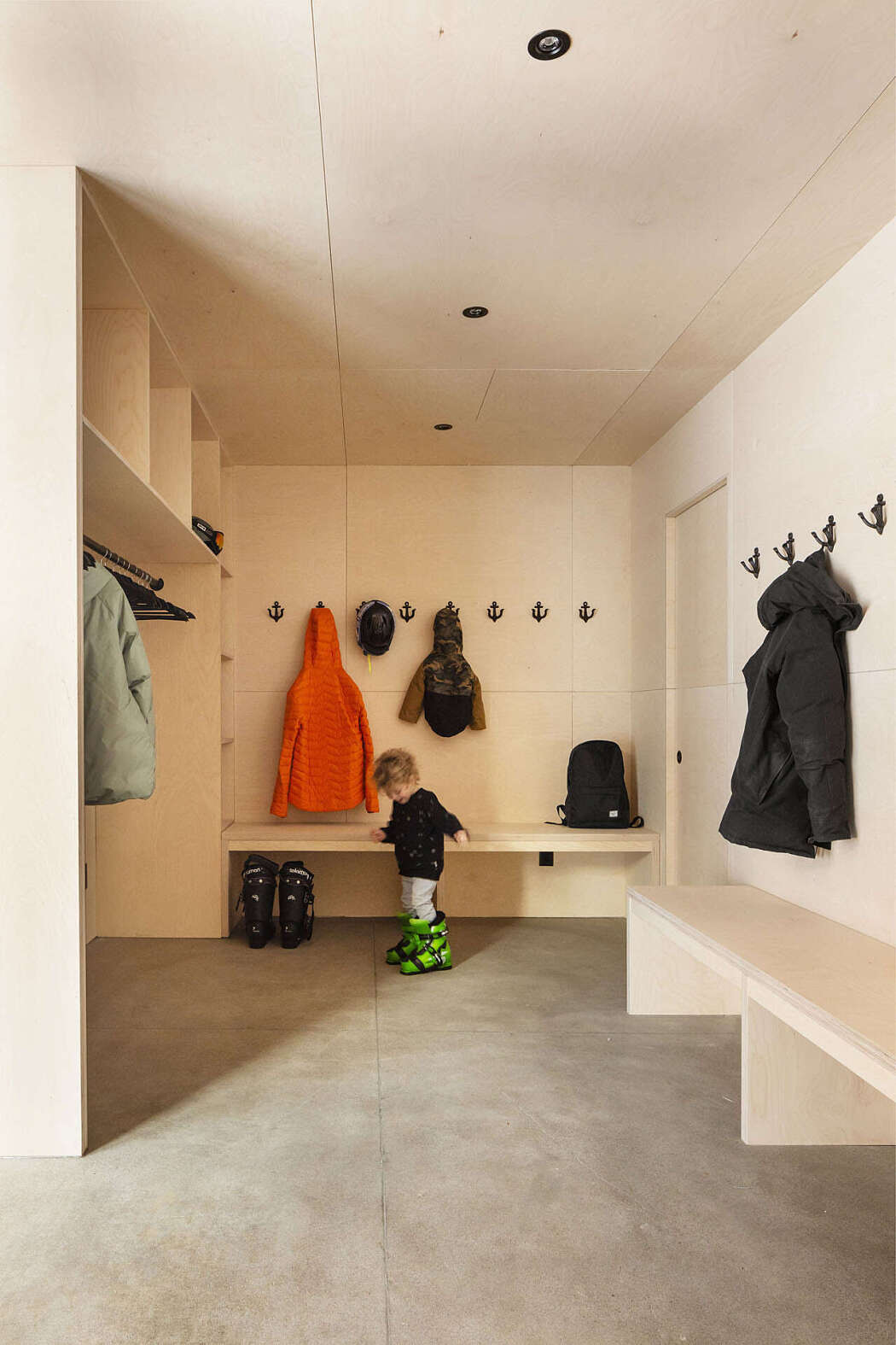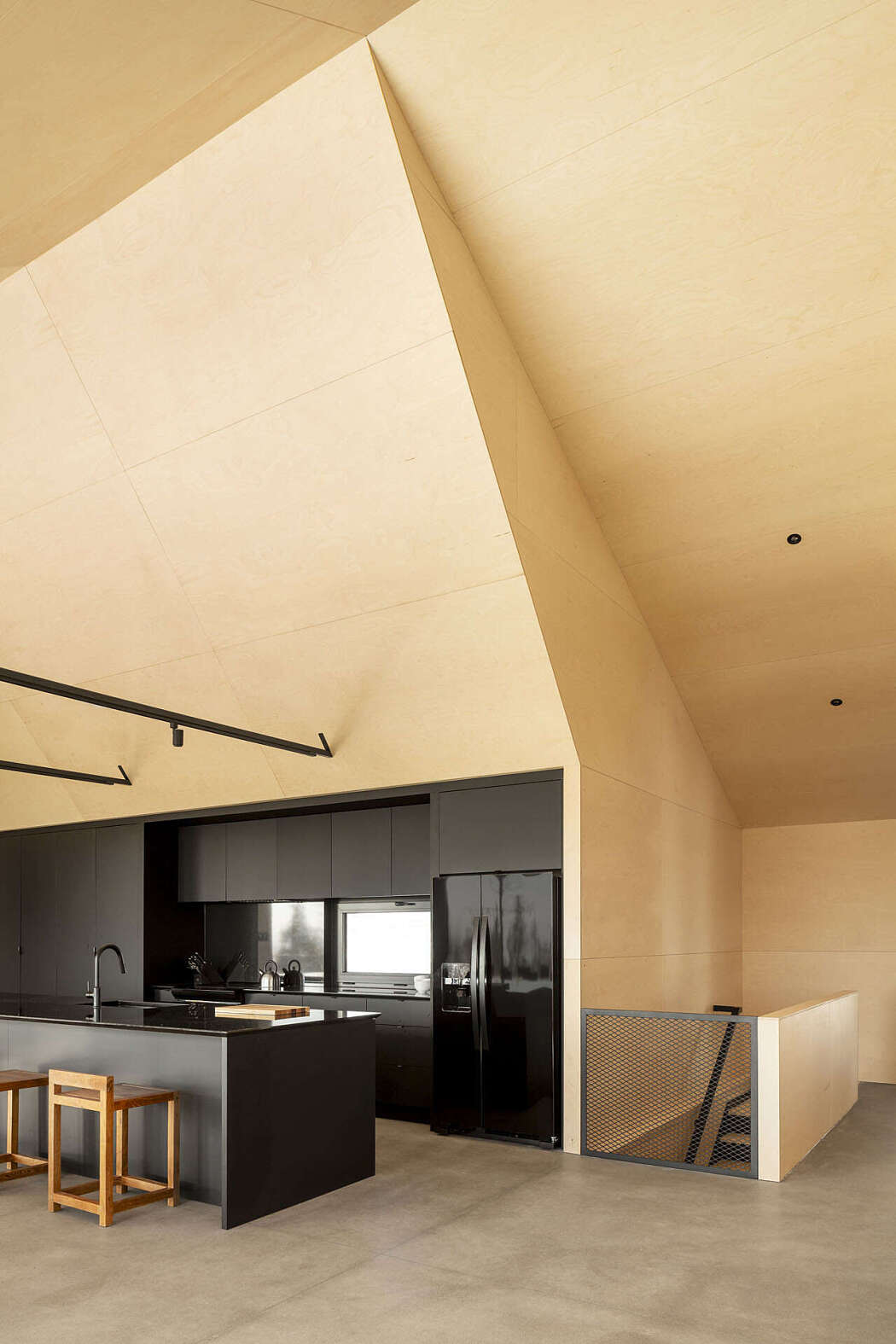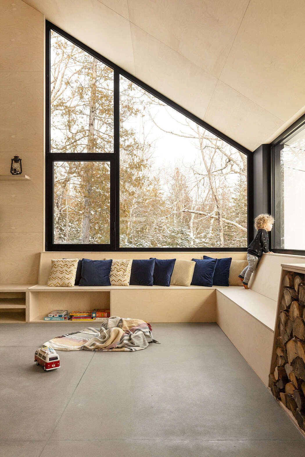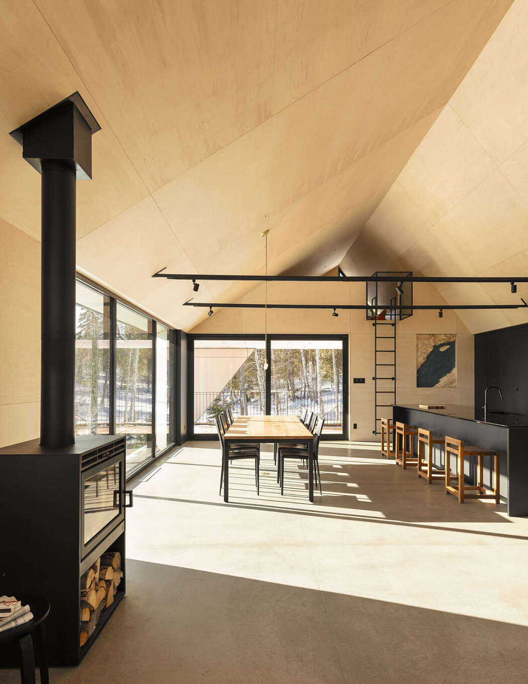 Russian plywood panels dress the spacious living and dining area, also crafting the built-in furnishings. Light-colored birch panels extend outdoors, starkly contrasting the dark metal roof and exterior cladding.