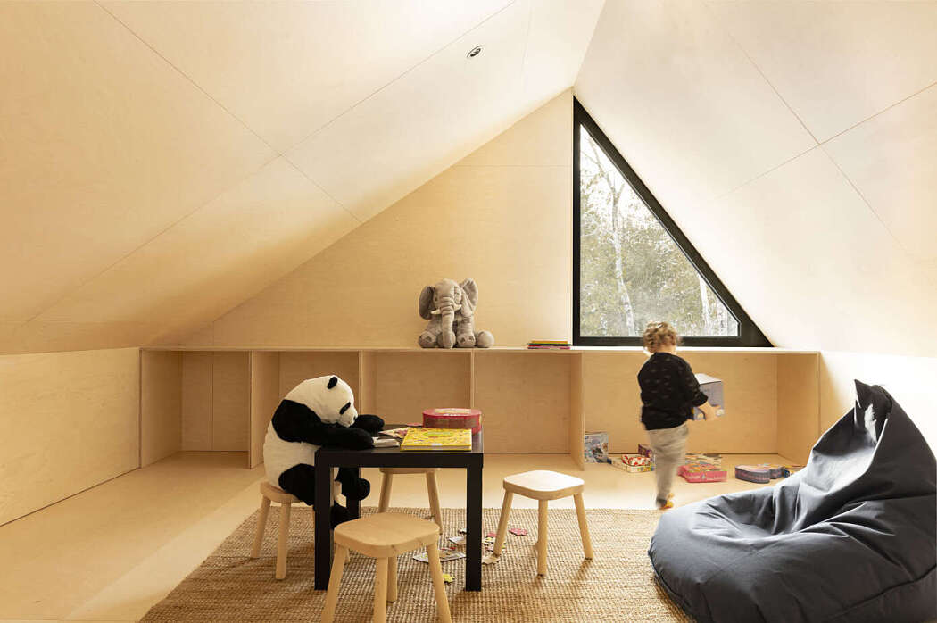 Descending from the entrance, a staircase leads to a semi-buried level. Here, three bedrooms and a children’s dormitory offer abundant sleeping quarters. Additionally, a central playroom connects to a secluded spa beneath the ground floor deck.