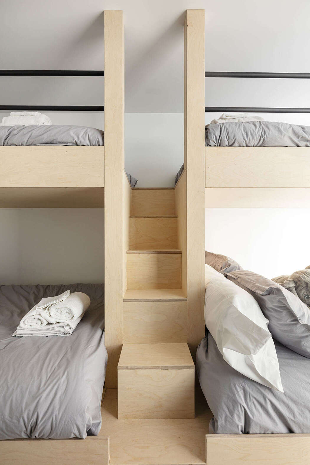 For design inspiration, a team of architects and graphic artists consulted the International Code of Signals (ICS), a staple in maritime communications. The Alfa signal shaped the building’s design, with naval touches peppered throughout. The cabin’s triangulated roof mirrors sails against the wind, while a spacious wooden terrace offers ship deck vibes and river views. Wood paneling in the shared living space enhances the nautical theme.