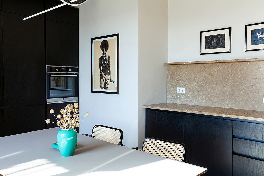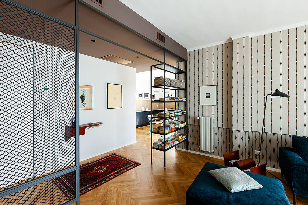 Their interior design centers around material selection. Oak parquet, Vienna straw from Cesca chairs, and Navona travertine in the kitchen stand out. Additionally, metal mesh dividers and Japanese raffia wallpapers bring memories of bygone eras. Yet, they cleverly adapt these materials to modern requirements.