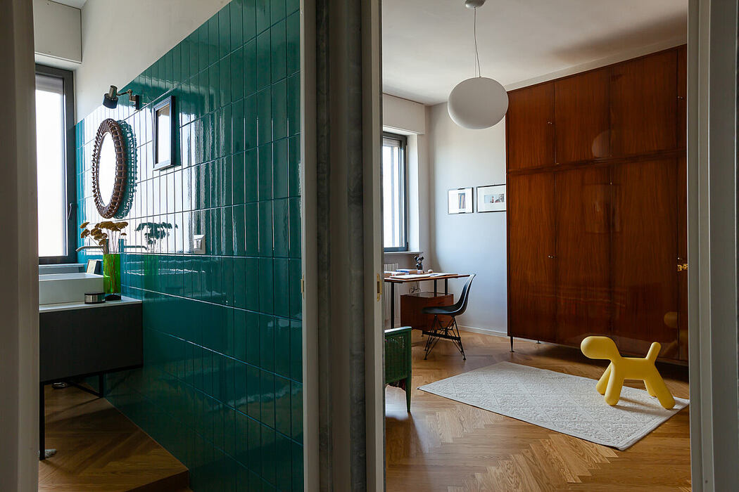 Claudio’s designs, paired with select vintage pieces, establish a dialogue between eras. Consequently, the rooms speak a contemporary language, never overshadowing the apartment’s innate charm.
