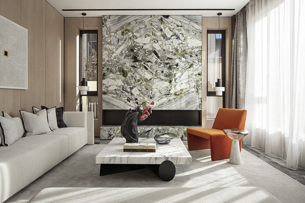 The marbles, with their jade-like textures and intricate patterns, exude nature’s artistry. Wooden veneers paired with light gray fabrics (akin to muted silver) set a warm, unpretentious tone. This delicate balance speaks to both logic and the natural philosophy of life.
