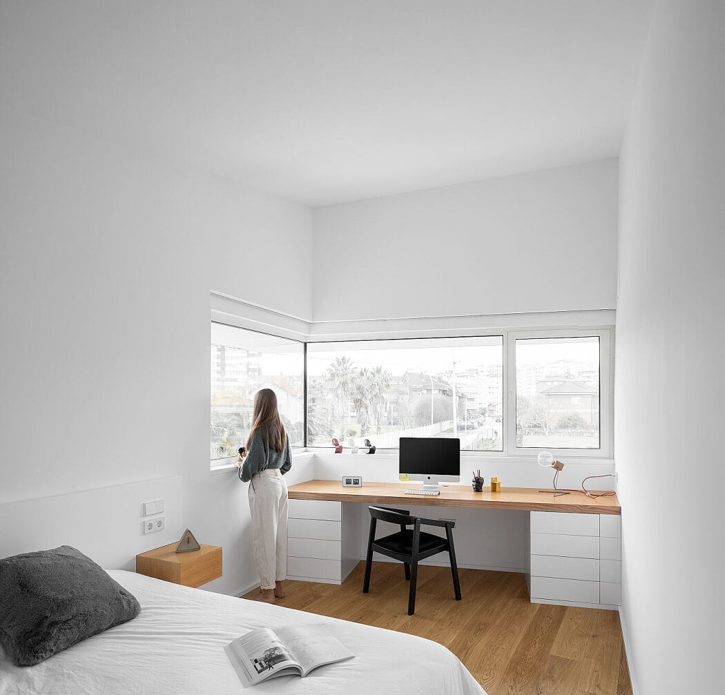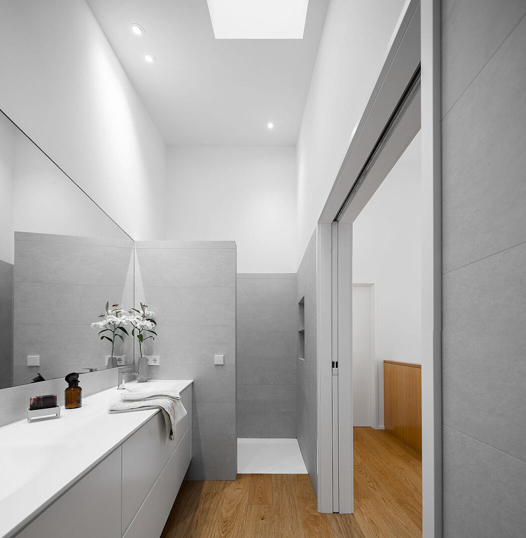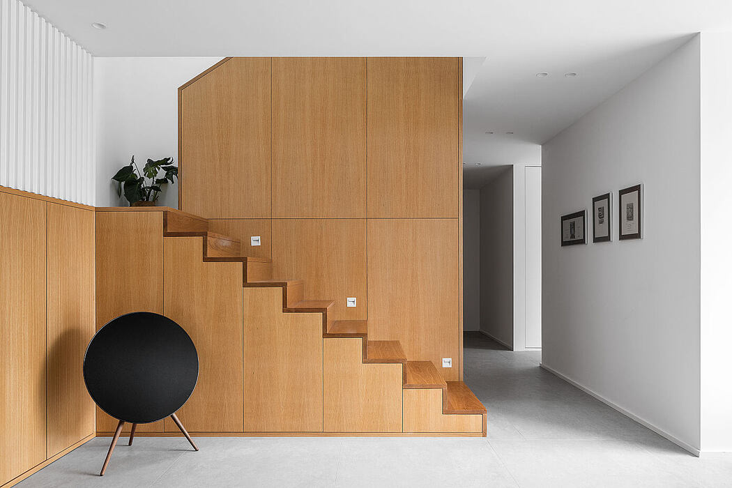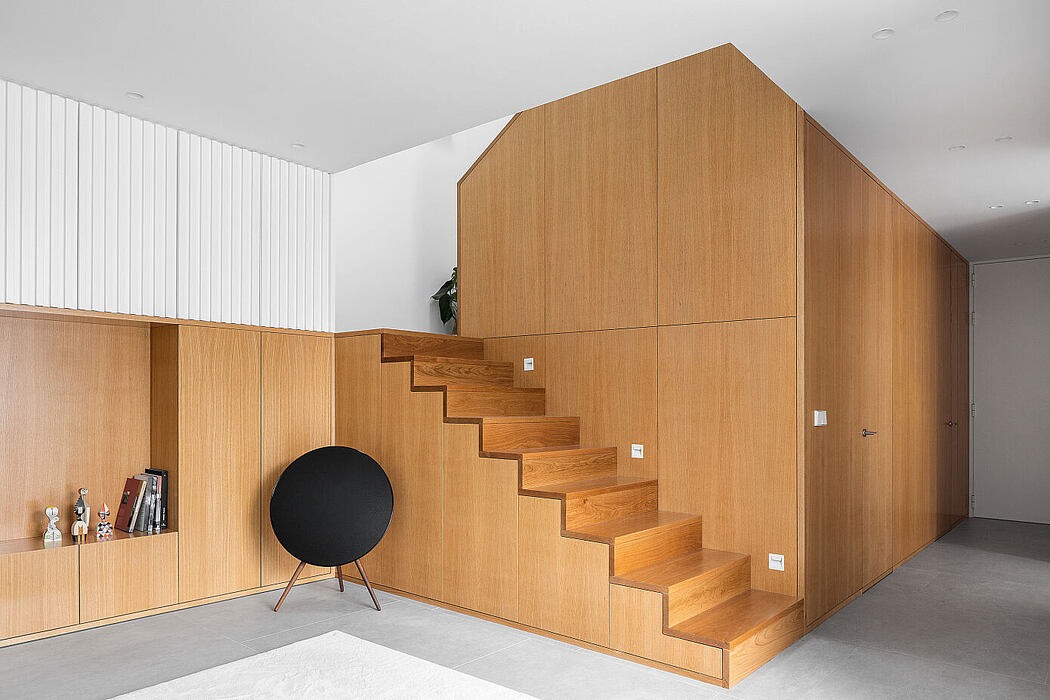 Inside, a minimalist warmth prevails. Oak wood connects various areas, while authentic paneling ties the entryway and stairs together. Combined with thoughtfully chosen furniture, the design showcases contrasting textures, transitioning to a pristine white halfway up the staircase.