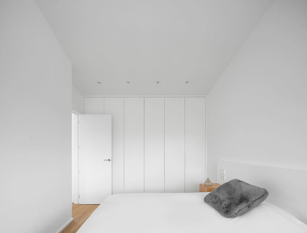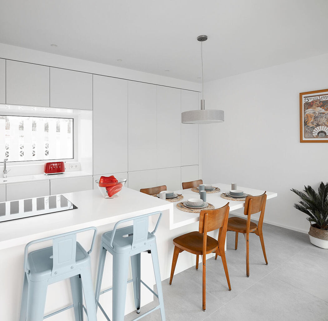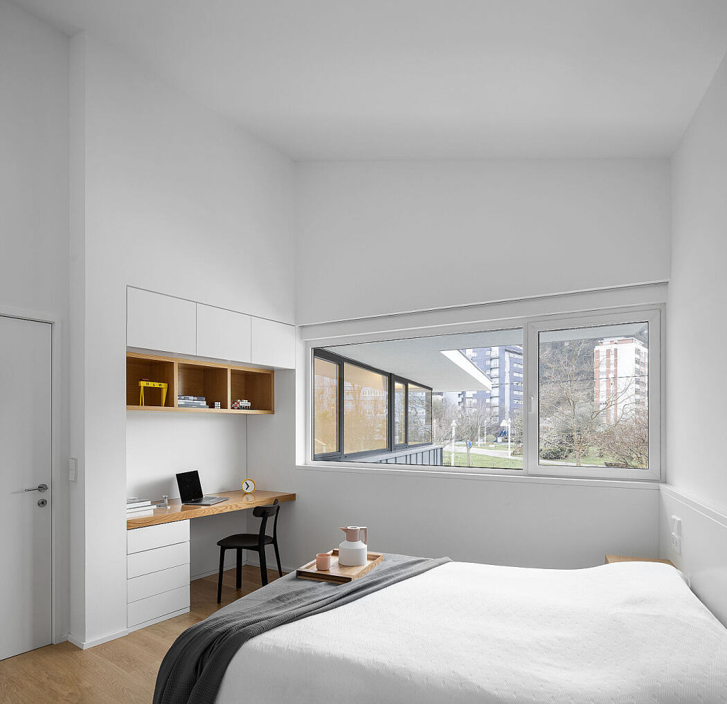 Inside, a minimalist warmth prevails. Oak wood connects various areas, while authentic paneling ties the entryway and stairs together. Combined with thoughtfully chosen furniture, the design showcases contrasting textures, transitioning to a pristine white halfway up the staircase.