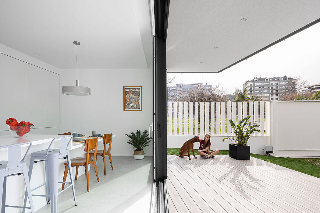 In Salinas, Asturias, lies a unique family residence on a trapezoid lot, bridging a townhouse complex and a standalone home.