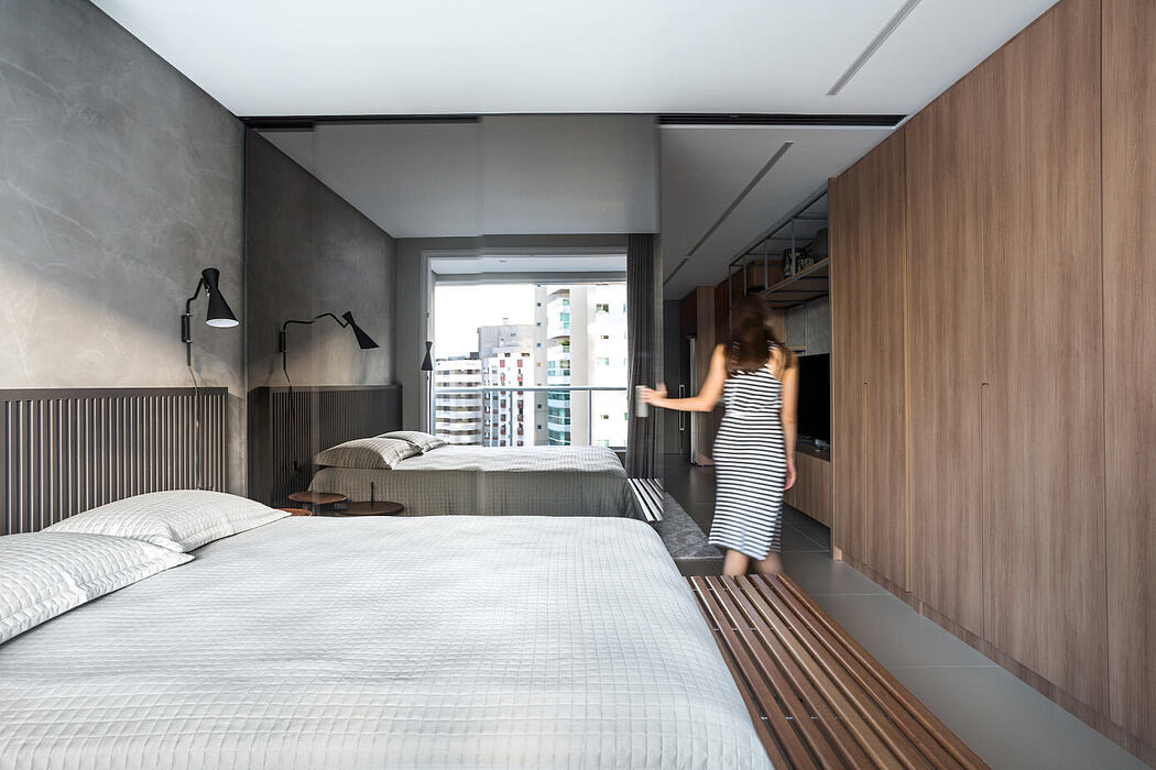 A solitary window offers breathtaking views of downtown Florianópolis and floods the apartment with light. As sliding doors close, artificial lighting takes center stage, introducing fresh ambiance.