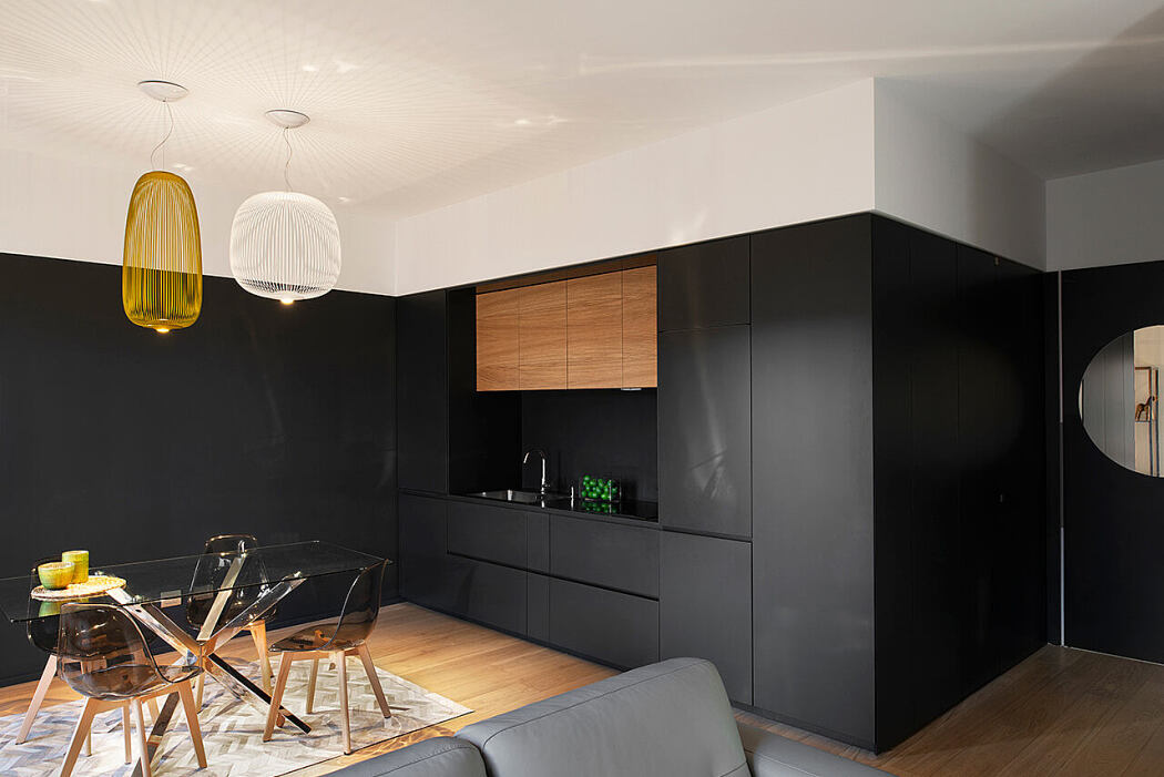 Half the apartment’s footprint became the living, dining, and cooking domain. This distinct separation also appears in the planimetric design. The entrance, hallway, and bathroom share the remaining space. How did we maximize functionality in such a compact space? The furniture itself became an integral part of our vision.