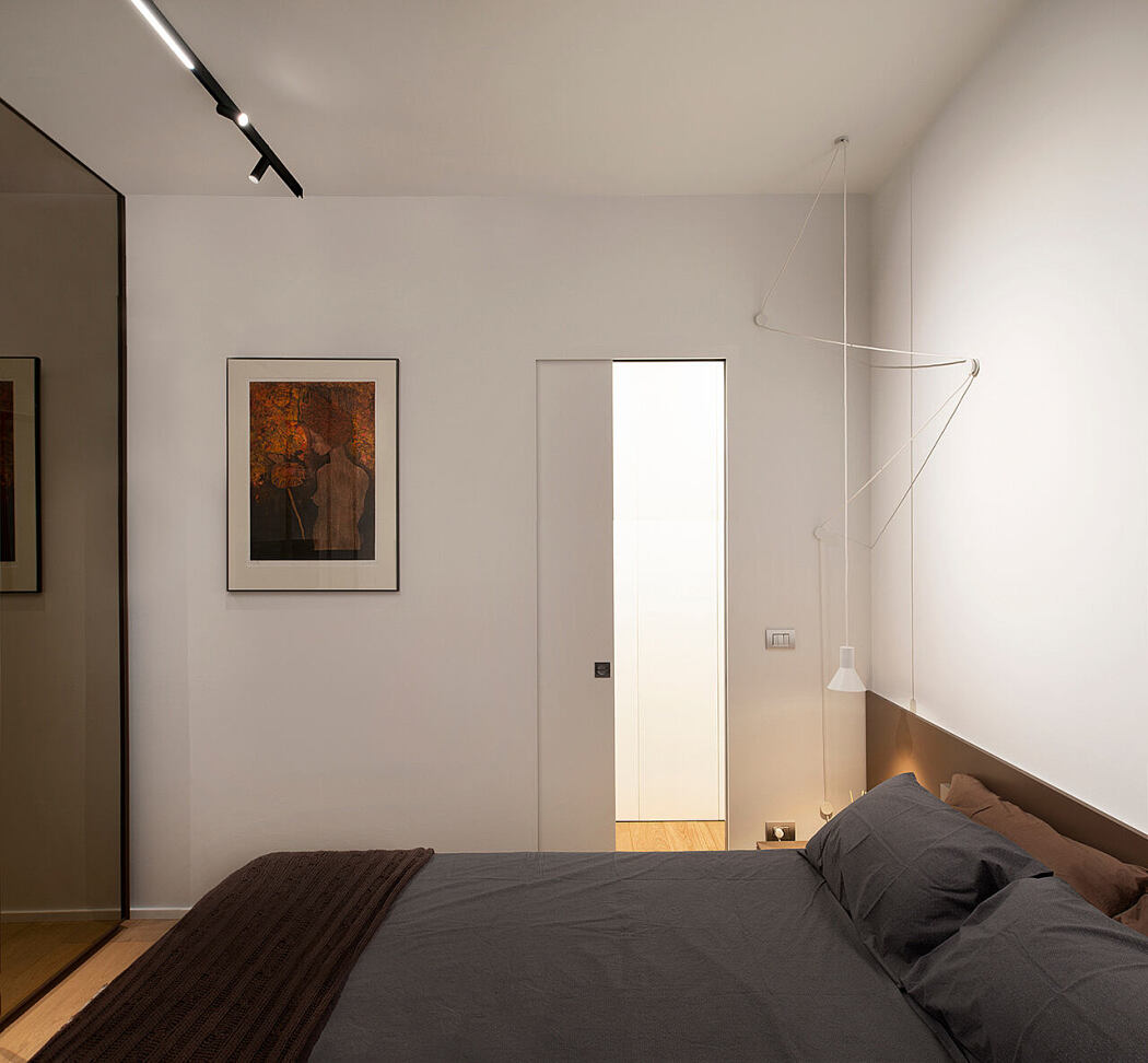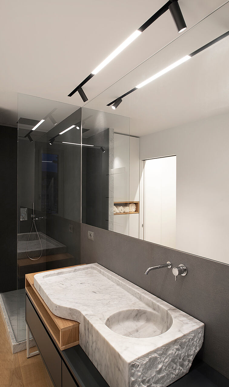 Light unveils the beauty of materials and surfaces. Thus, our design, reminiscent of an exhibition space, required meticulous lighting. We chose museum-quality illuminating covers, juxtaposing projectors and diffusers within a recessed ceiling track. The result? An architectural masterpiece.