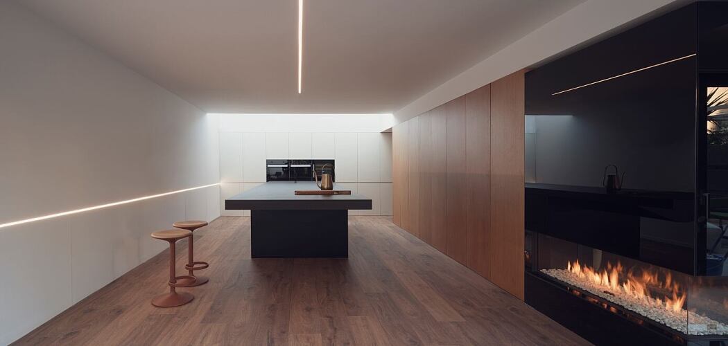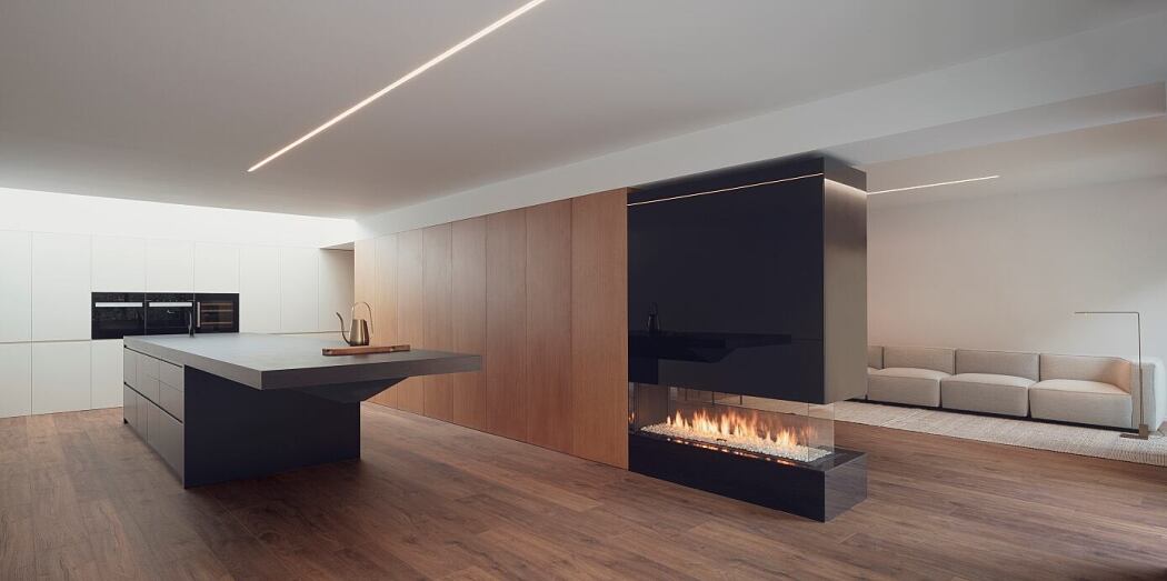 The revamped ground floor showcases a seamless space. Strategically placed furniture and a dual-sided fireplace subtly distinguish the kitchen from the living room.