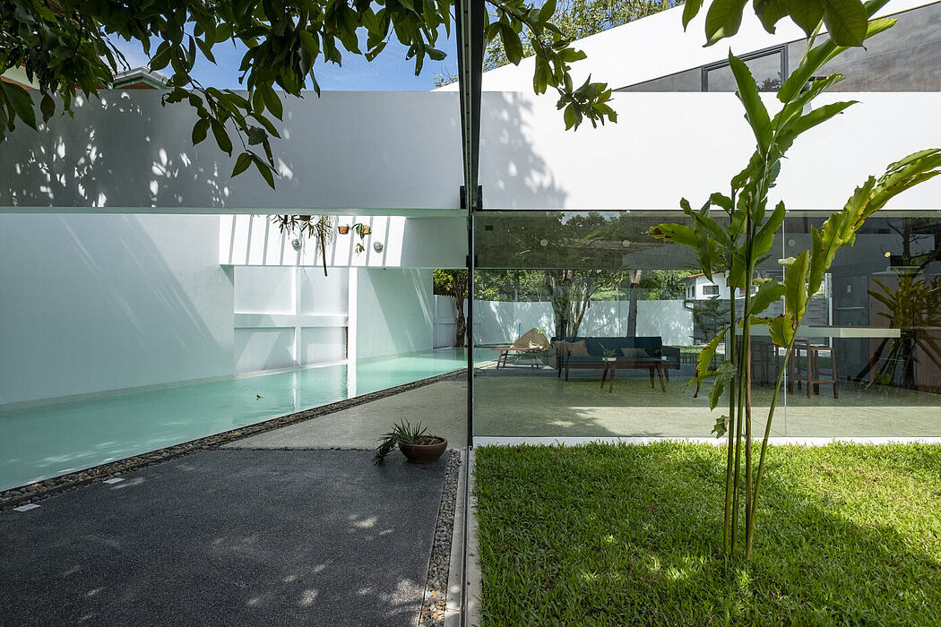 A pool stretches longitudinally, mirroring light and color onto the white volumes. It opens towards a tropical bathroom above.