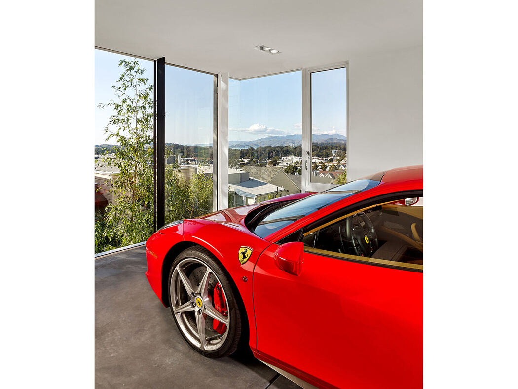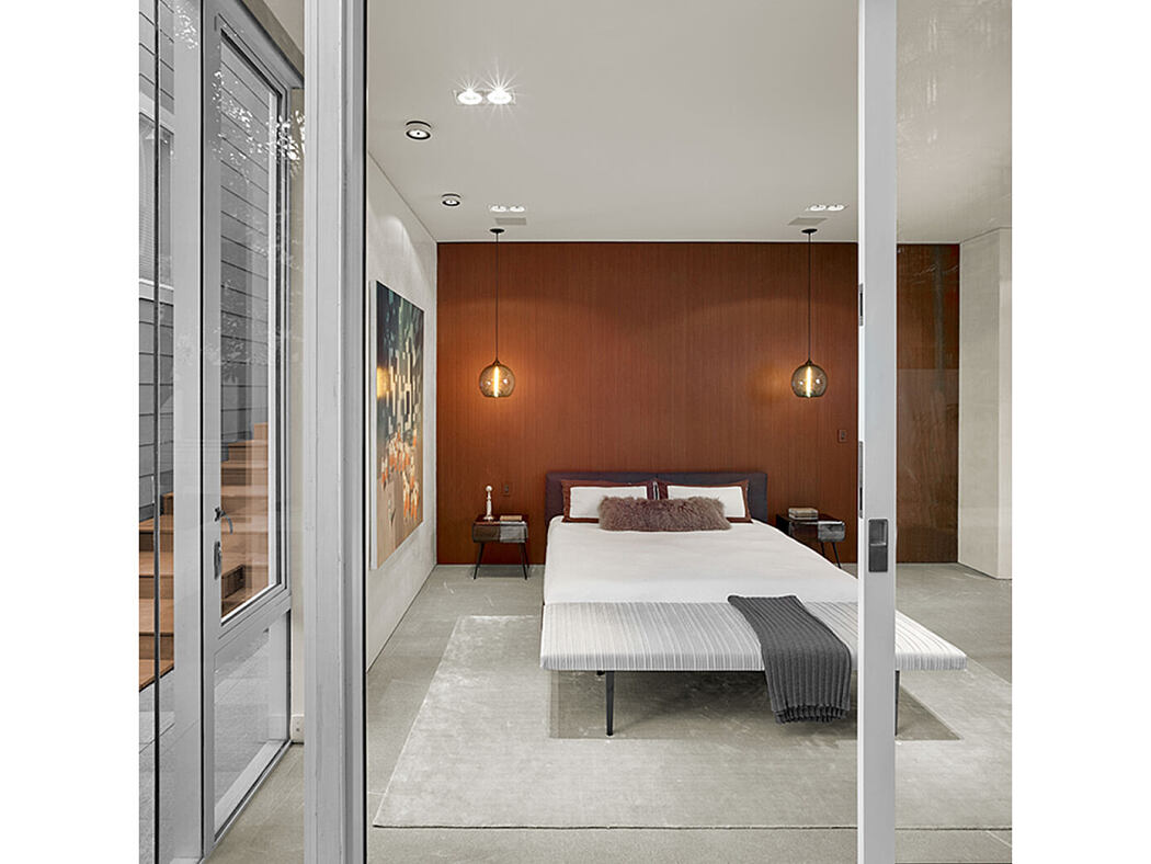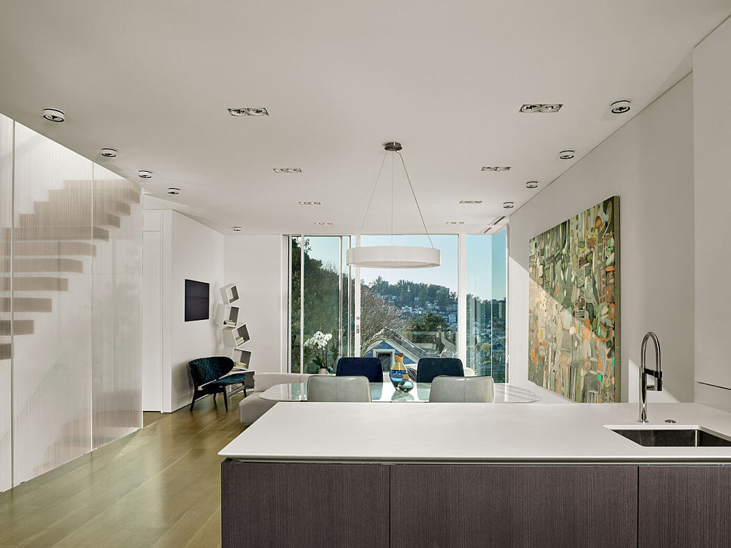 Each level of the north and west facades, including the garage, was skinned in floor-to-ceiling glass. This design choice allowed for an abundance of natural light and further emphasized the stunning views. A floating open-riser stair with a continuous translucent patterned glass wall connected all the floors, organizing the house both visually and spatially.