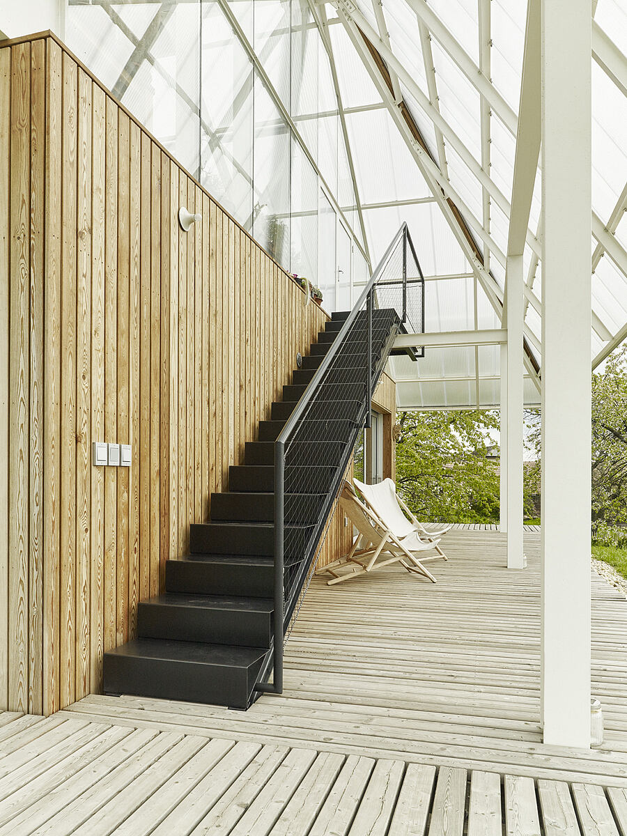 Our design defies the traditional home hierarchy. Instead of a single main entrance and hallway, we provide direct access to living areas and bedrooms. A single-arm steel staircase on the terrace offers a separate entrance to the rooftop greenhouse. We’ve also encircled the entire house with a walk-on terrace, fully sheltered by the overhanging roof. Thanks to sliding windows, every room in the house directly connects to this terrace.