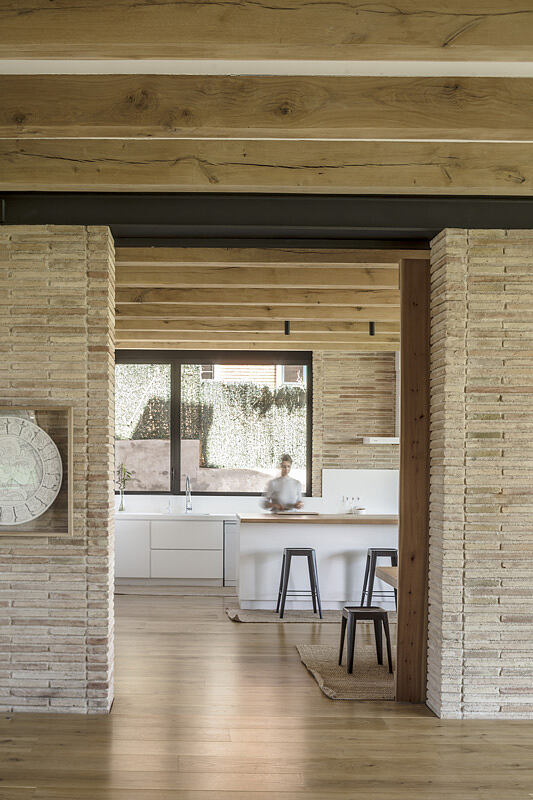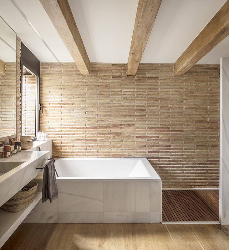 The bricks, handmade by master craftsmen at a local factory and designed by Jofre Roca arquitectes, determined the dimensions of the spaces and enabled specific wall solutions. Special molds were used to create the bricks, and a unique sludge mix was employed to provide the desired flexibility and hardness. These bricks were fired using crushed olive stones, lending each brick a varying reddish hue and achieving the desired texture.