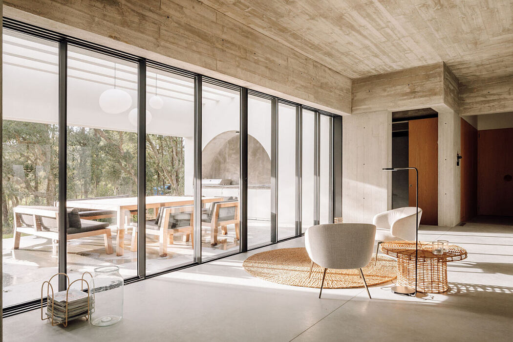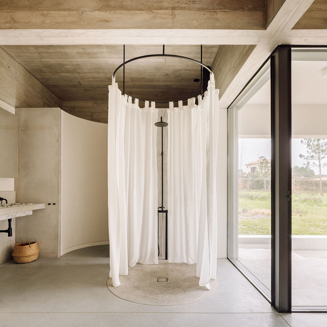 A diagonal journey through the house unveils varying degrees of intimacy. One can start from the semi-private terrace and move into the bedroom. Space subtly contracts in the bedroom vestibule, easing the transition to the expansive living room that opens up to the landscape. The sequence then gracefully reverses, leading one to the opposite corner of the house, capturing an architectural symphony of space, intimacy, and design.