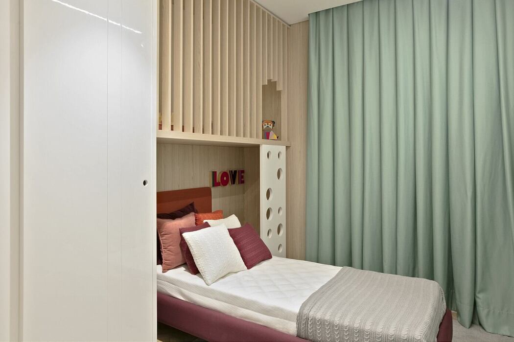 In the baby’s bedroom, woodwork comes to the fore, creating an ideal space for reading and playful interactions.