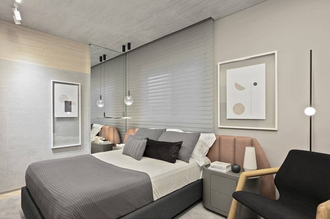 In the bedrooms, and particularly in the master bedroom, the use of earth tones mirrors the overall theme of the apartment, forging a unique aesthetic language and identity.