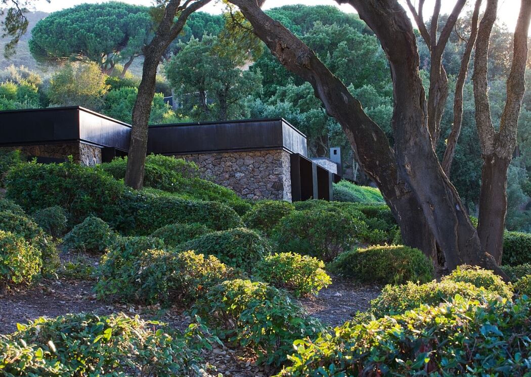 The landscape design, a collaborative effort between Lazzarini Pickering and Paolo Pejrone, celebrates the forest’s diverse species, from orchids to mosses and lichens. An intricate pathway, comprised of wooden platforms and stairs, hovers above the underbrush. This path’s orthogonal geometry winds through the entire property, accentuating the pine trees, cork trees, and holm oaks populating the park.