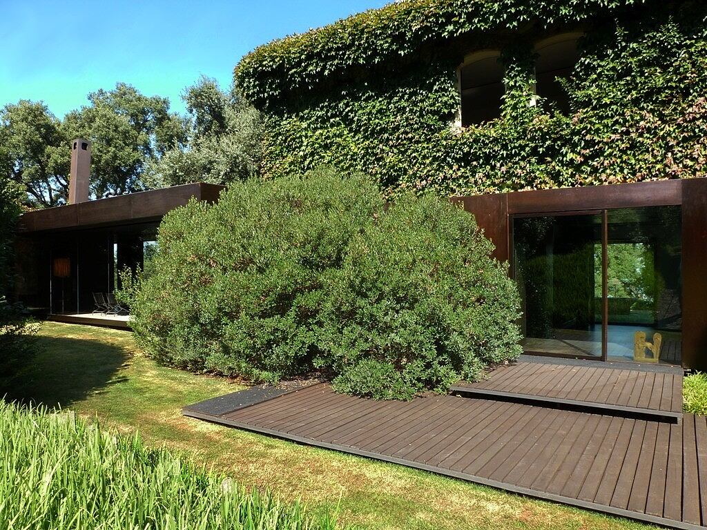 The main villa elegantly embraces an original nineteenth-century tower at its heart. The interior of this tower underwent a complete redesign, striking an engaging dialogue with a new prismatic structure made of rusted steel and glass. The ancient tower, shrouded in a lush cover of vines, maintains the privacy of the home’s more intimate spaces. In stark contrast, the glass walls of the new addition establish a seamless link between the interior and the sweeping natural landscape outside.