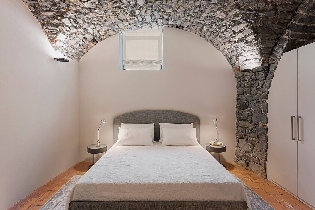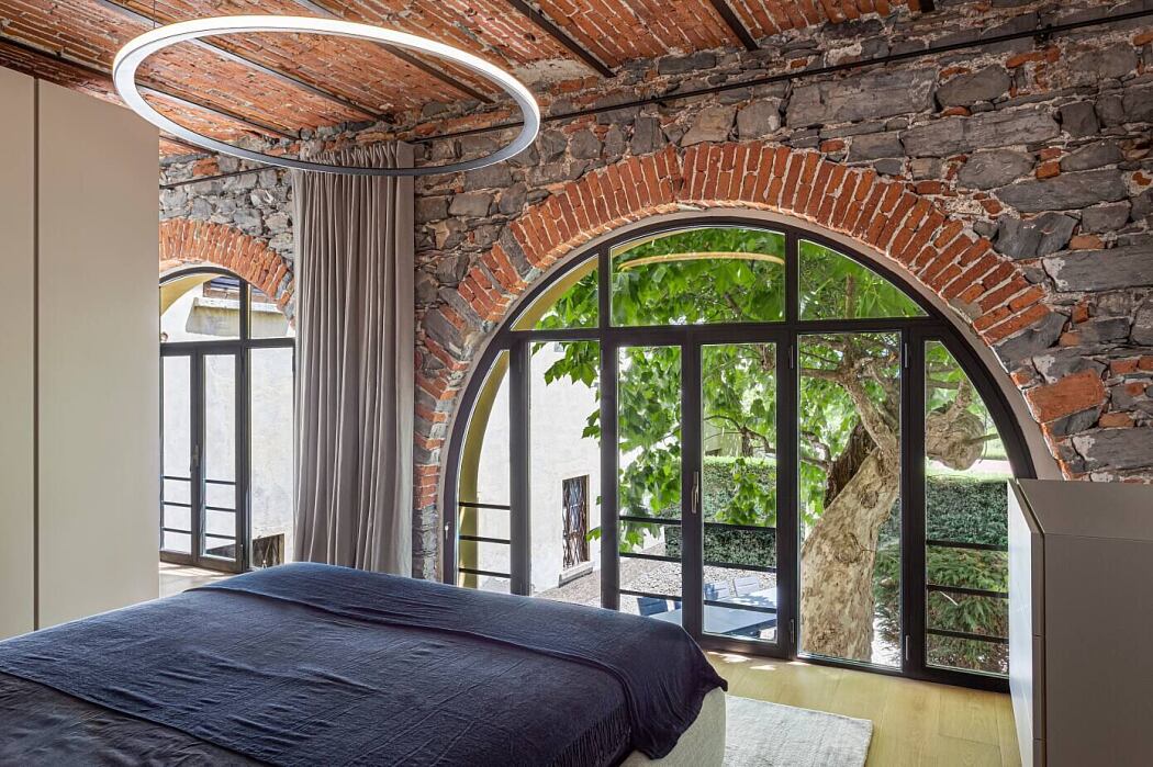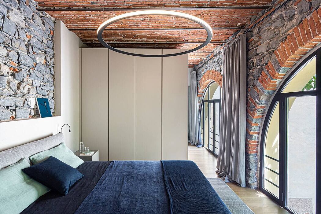 Spanning two floors and connected by an internal staircase, the house’s layout is designed to accentuate the historic structure’s original features. On the upper floor, the entrance leads into a sleek, linear kitchen that emphasizes the importance of the old stone wall. The kitchen opens up to a living room and a master bedroom with an en-suite bathroom, both offering direct views of the picturesque lake. Proceeding from the kitchen, you’ll find a unique dining room enveloped by stone walls and a large vaulted brick ceiling. The first floor also includes a guest bedroom with an internal bathroom, offering the perfect blend of privacy and style.