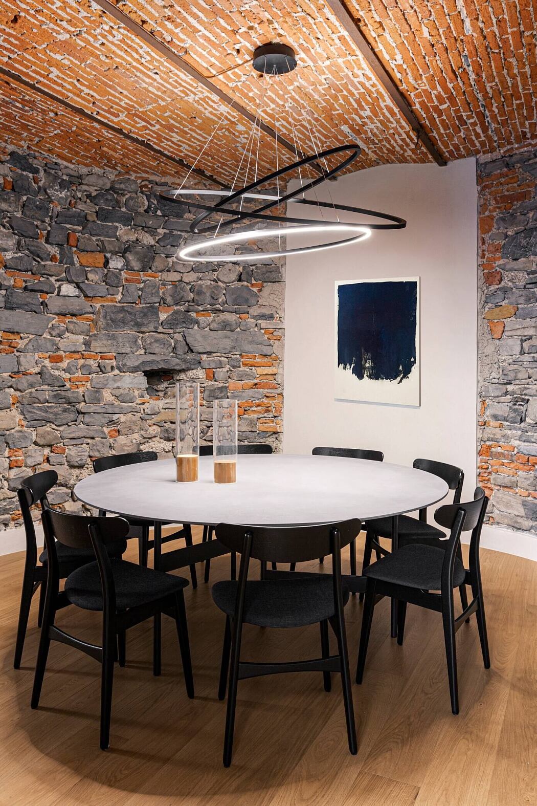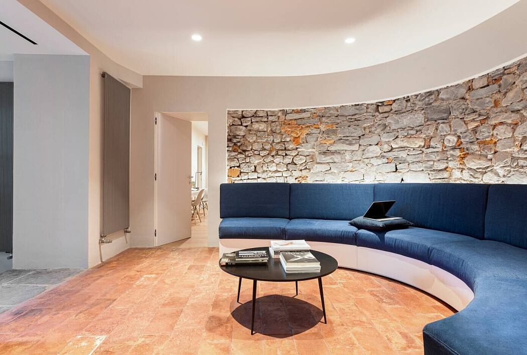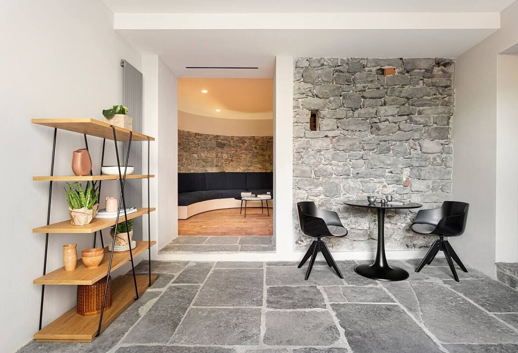 In the design process, we placed great emphasis on preserving the existing finishes such as the stone and brick walls, arches, and passages. The goal was to create a balance between these highly distinctive elements and sleek, minimal furniture that embellishes the rooms without overshadowing the existing character.
