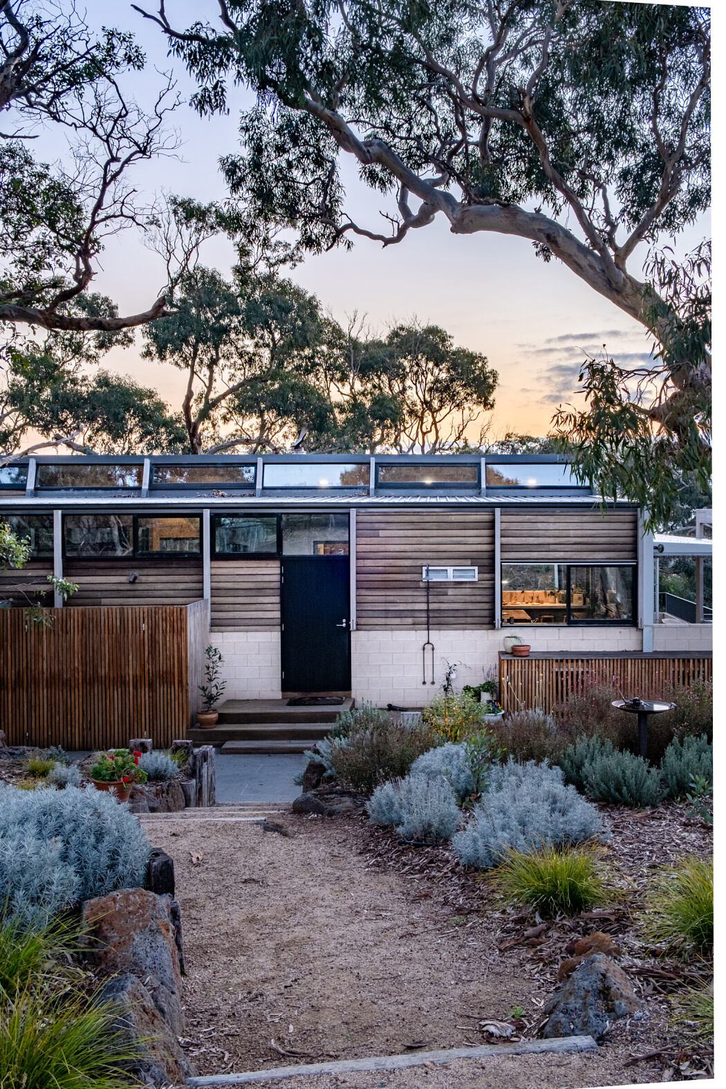 The site of the Bellarine Hillside House had its unique challenges with strong westerly breezes and a steep natural slope. There was also a critical need to preserve and incorporate the endangered yellow box eucalyptus trees into the design. The house’s form follows the land’s slope, channeling the strong winds upwards and over the structure to create a sheltered area basking in the northern sun.
