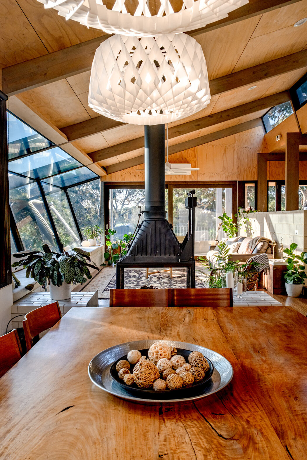 The home’s interior is lined with plywood, creating a warm contrast to the off-white concrete masonry. The heart of the house includes a breakfast bar, sloped high ceilings, and an eye-catching cast-iron double-sided wood heater that serves as a connection between the living and dining areas. The raw and industrial look of the Cheminees Philippe wood heater centerpiece strikingly contrasts with its white-glazed brick base, enhancing the warmth of the space.