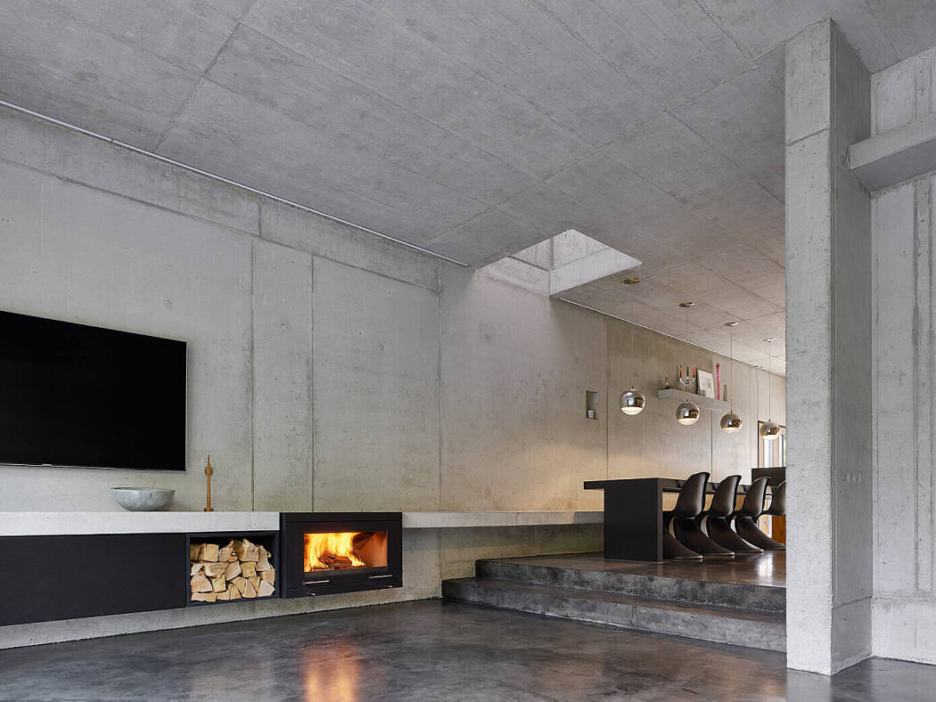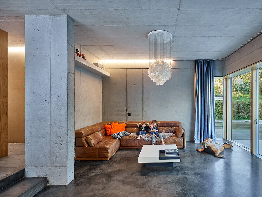 The interior design consistently incorporates only two materials: concrete and wood. The walls, floors, and ceilings remain exposed in untreated concrete, complemented by fixtures made from cast-in-place concrete or wood. The plumbing and underfloor heating system are installed directly into the concrete, contributing to the efficient control of the concrete core temperature, ensuring a cool summer and warm winter.