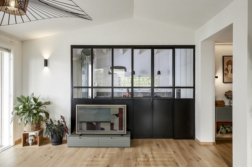 Upon entering the property, a large lawn frames the entire house, emphasizing its natural setting. Inside, the living room features a parquet floor that extends throughout the house. A large sofa, adorned with a suspended lamp, sits at the center of the room, drawing attention to the romantic lines that define the space. Corners come alive with an array of plants, while wall lamps illuminate the area and echo the iron details in the surrounding furnishings. The TV cabinet rests below a custom-designed window frame with sliding doors that lead to the kitchen. A large sliding window on the perimeter wall opens to an airy veranda, integrating with a soft curtain for seamless indoor-outdoor communication. Changes in the ceiling’s direction further emphasize the division of spaces.