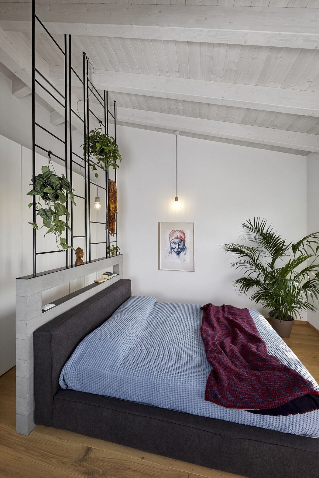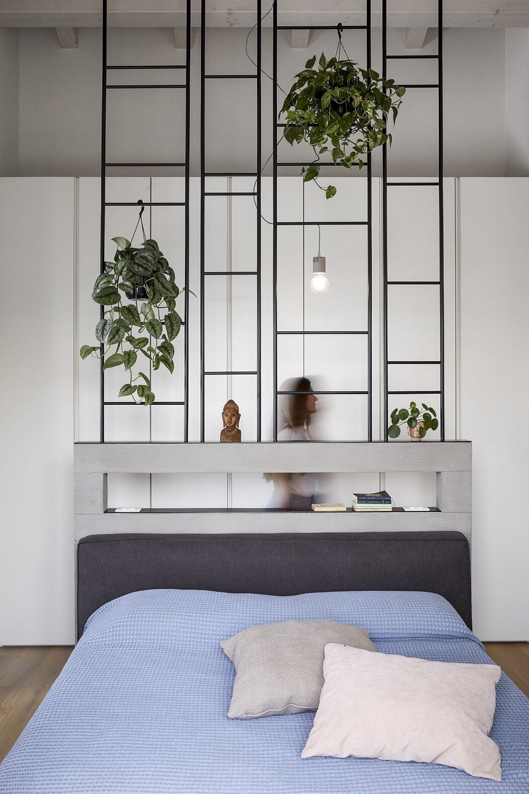 A custom-made headboard takes center stage in the master bedroom. Designed as a partition, the headboard allows the wardrobe to be placed out of sight. A concrete-effect wall, incorporating a void for sockets and switches, supports full-height tubes that create an original decorative design. This versatile space also serves as a passage to the custom-designed wardrobe, maximizing storage capacity.