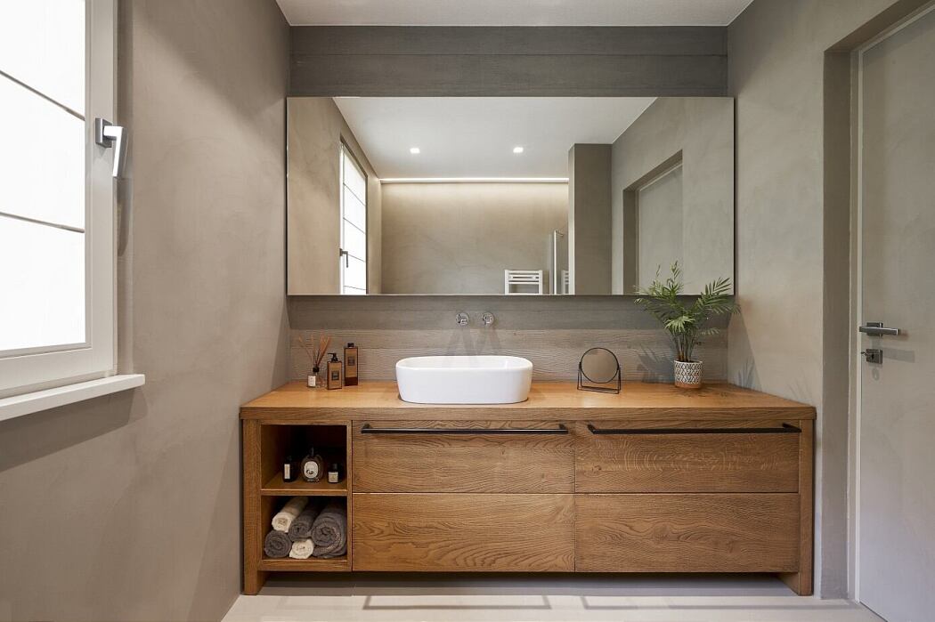 The bathroom presents a captivating mix of surfaces, where the uniformity of resin, the materiality of natural wood furniture, and the contrasting effects of marble and concrete coexist harmoniously. A flush door provides seamless access to the space.