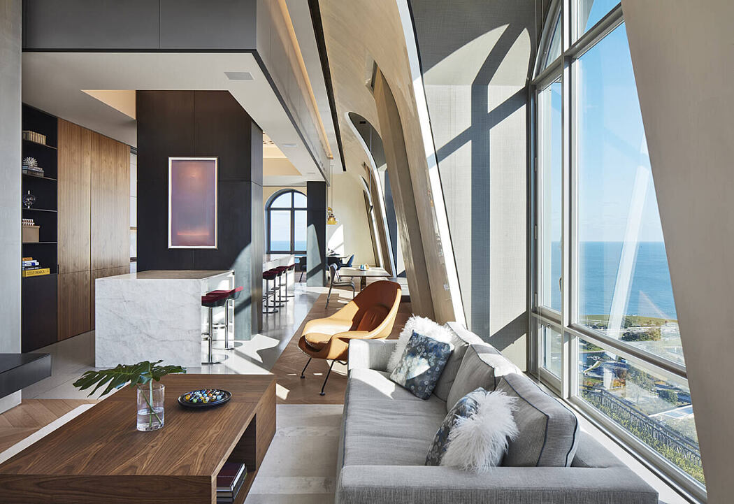 Situated within a two-story mansard penthouse with stunning 270-degree views, this Chicago duplex apartment establishes a series of material layers that unfold around a J-shaped plan and create spaces between them.
