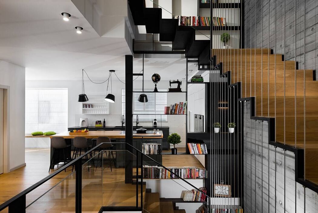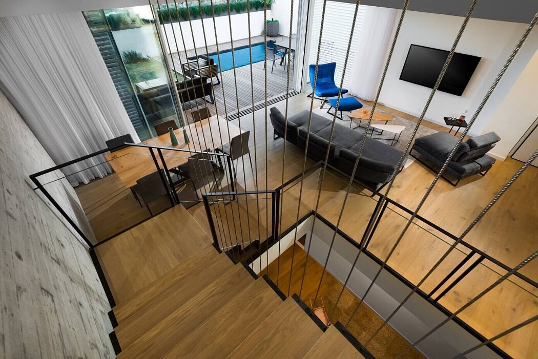 The entrance floor is designed with a large open area, located alongside the garden area and entrance, creating a sense of wide-open space. The only walled area is a long 2 family wall without openings. This element was utilized to create a large exposed concrete wall that accompanies the entire length of the house and staircase, which is a central design element. The vertical axis that connects all floors, from the basement to the top floor. It is a dominant and significant wall that gives depth to the home and will be a wonderful backdrop for stairs. The staircase is made of 12 mm thick tin, with oak paneling, which looks like the wood is “swallowed” in metal. Its central railing is made of stainless-steel strings.