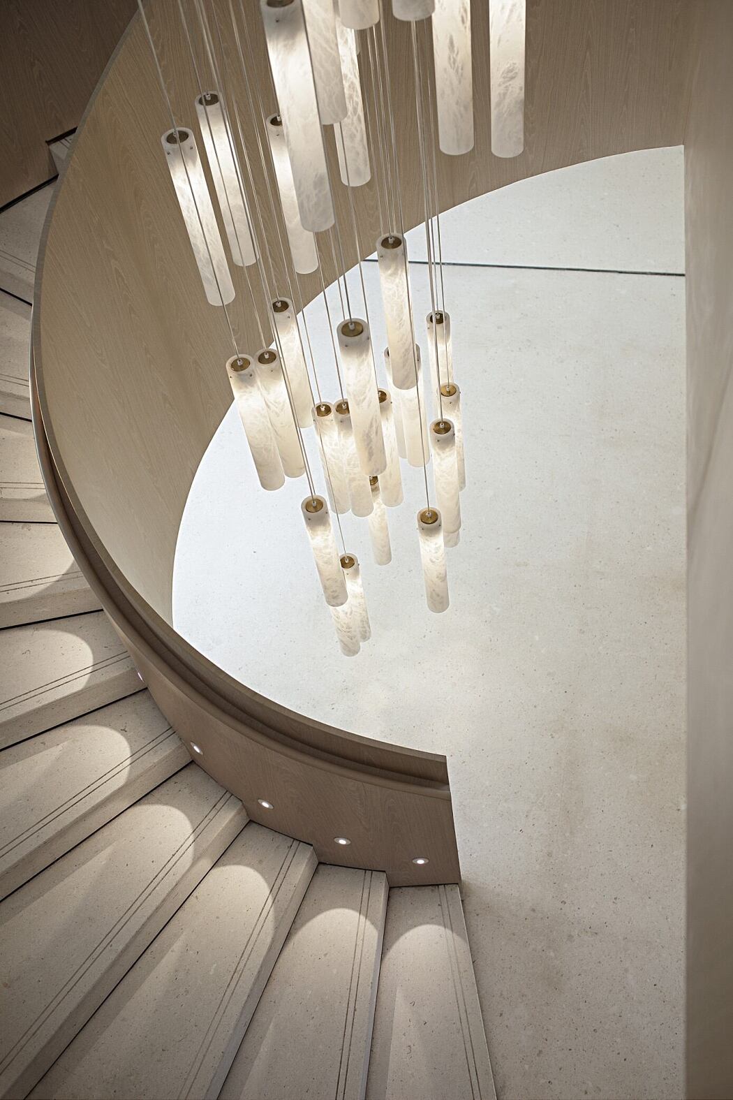 Lights dotted at the staircase area generate a fantastic ambience. The use of lights is skillful, which realizes gentle transition of brightness. The spiral route enables a build-up for emotions and evokes interaction in a playful manner.