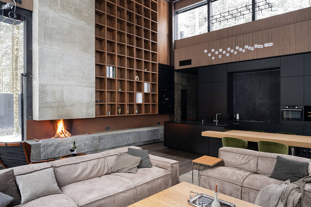 The client initially did not know at all what he wanted. He was thrown from side to side from a heavy suite to ascetic nothingness … he asked to make an ordinary hut in the forest, while he never perceived things or economy-class furniture … One day he wanted to see absolute brutality in the house, on another day he swore at us what could one offer him such a thing and what is all this for, here is a good design (pointing and poking at pictures with heavy luxury) .. As a result, we were looking for a design for a very long time. We tried to understand who he really is, our Client, what he needs. So, at some point we felt the edge of moderate luxury at the junction with asceticism and brutalism … and he began to like him (and we too). As a result, we began to mix expensive surfaces (walnut veneer or expensive furniture elements such as sofa chairs and armchairs) with absolutely brutal ascetic ones – concrete, stone (I personally went to Turkey to Denizli (this is in the Pamukkale region) is rich in various types of travertine, and it was there that I found the texture and color of the stone that I had been looking for in Moscow and Russia for so long, but without success … I had to go around no quarry in Turkey to find the very stone that we needed), a fence (yes, if look at the ceiling, there will be fence boards – his story is this: there was an old fence on our site .. so we gave it a second life – we restored it and nailed it to the ceiling, absolutely the entire fence went to the ceiling, and painted it black and be sure to use hands and a brush … so that the texture and pattern are visible).