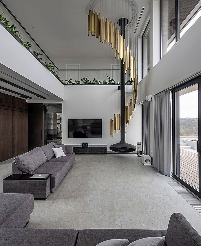 Bedrooms there feel like high-level hotel rooms. They are thoughtfully comfortable and emotionally neutral. Calm grey and beige color palette enlarge the warm shade of the nutwood. The most significant decorative accent is the green frame of live plants on the corbel around the glass banister on the first floor. The pendant Focus fireplace is suspended from the 6-meters high ceiling in the living room. Above the fireplace, we hung up the lamp from numerous brass tubes which reminds the traditional Chinese décor Wind Chime. This lamp is a custom object we created for the house and checked that pipes did not make any sound tangency with each other.