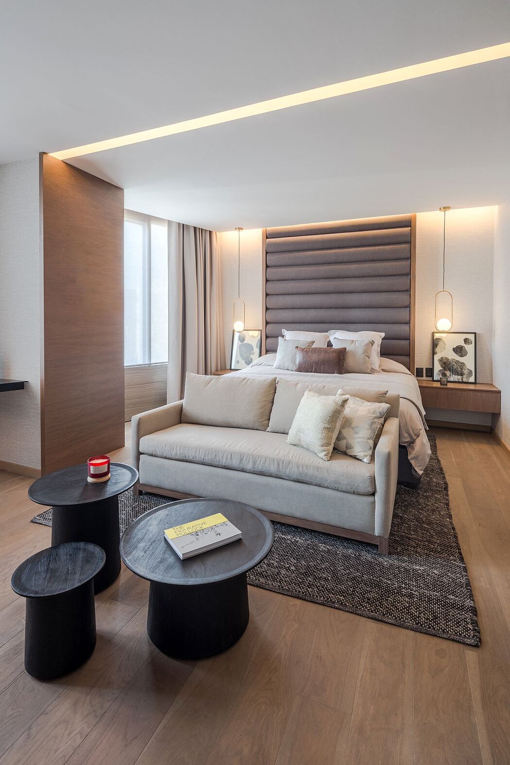 The master bedroom is a space completely devoted to relaxation, art and enjoying the view. All the walls are finished in walnut wood panels and leather. The reading and working area are complemented with Blu Dot furniture, adding a playful detail to the space.
